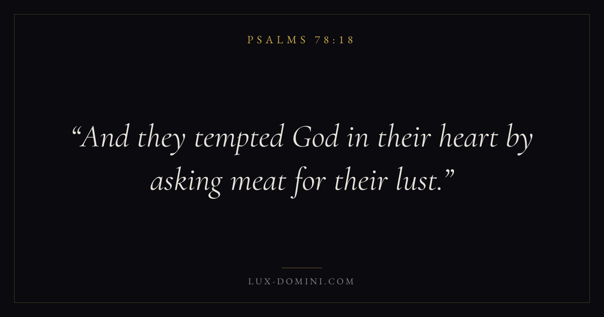 Books / Psalms / Chapter 78 / Verse 18 ← Psalms 78:17 Psalms 78:18 Psalms 78:19 → And they tempted God in their heart by asking meat for their lust. Download verse card Share on Twitter Share on Facebook Pin it ✦ Key themes FaithPrayerPraiseLament Read with Hebrews 11:1Romans 10:17Matthew 6:9Luke 18:1 Related topics Bible verses about faithBible verses about prayerBible verses about thankfulness and gratitudeBible verses about grief and loss ✦ Psalms Chapter 78 verses V. 1 V. 2 V. 3 V. 4 V. 5 V. 6 V. 7 V. 8 V. 9 V. 10 V. 11 V. 12 V. 13 V. 14 V. 15 V. 16 V. 17 V. 18 V. 19 V. 20 V. 21 V. 22 V. 23 V. 24 V. 25 V. 26 V. 27 V. 28 V. 29 V. 30 V. 31 V. 32 V. 33 V. 34 V. 35 V. 36 V. 37 V. 38 V. 39 V. 40 V. 41 V. 42 V. 43 V. 44 V. 45 V. 46 V. 47 V. 48 V. 49 V. 50 V. 51 V. 52 V. 53 V. 54 V. 55 V. 56 V. 57 V. 58 V. 59 V. 60 V. 61 V. 62 V. 63 V. 64 V. 65 V. 66 V. 67 V. 68 V. 69 V. 70 V. 71 V. 72