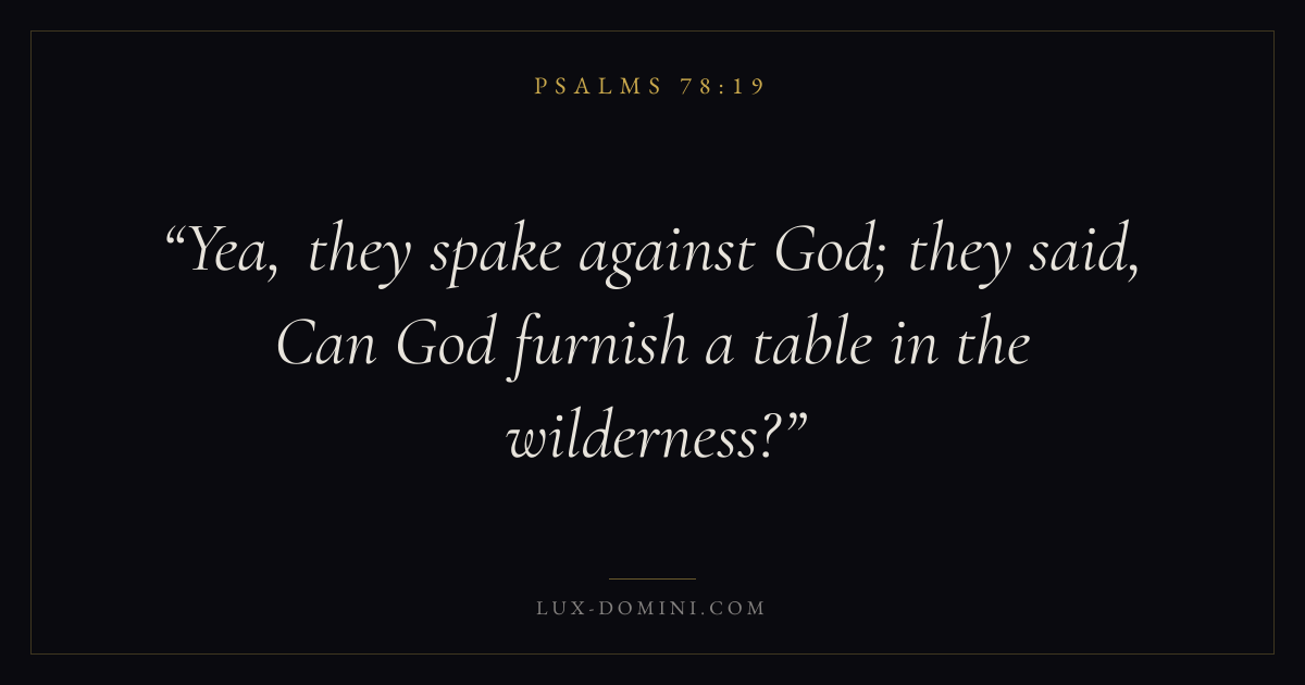Books / Psalms / Chapter 78 / Verse 19 ← Psalms 78:18 Psalms 78:19 Psalms 78:20 → Yea, they spake against God; they said, Can God furnish a table in the wilderness? Download verse card Share on Twitter Share on Facebook Pin it ✦ Key themes FaithPrayerPraiseLament Read with Hebrews 11:1Romans 10:17Matthew 6:9Luke 18:1 Related topics Bible verses about faithBible verses about prayerBible verses about thankfulness and gratitudeBible verses about grief and loss ✦ Psalms Chapter 78 verses V. 1 V. 2 V. 3 V. 4 V. 5 V. 6 V. 7 V. 8 V. 9 V. 10 V. 11 V. 12 V. 13 V. 14 V. 15 V. 16 V. 17 V. 18 V. 19 V. 20 V. 21 V. 22 V. 23 V. 24 V. 25 V. 26 V. 27 V. 28 V. 29 V. 30 V. 31 V. 32 V. 33 V. 34 V. 35 V. 36 V. 37 V. 38 V. 39 V. 40 V. 41 V. 42 V. 43 V. 44 V. 45 V. 46 V. 47 V. 48 V. 49 V. 50 V. 51 V. 52 V. 53 V. 54 V. 55 V. 56 V. 57 V. 58 V. 59 V. 60 V. 61 V. 62 V. 63 V. 64 V. 65 V. 66 V. 67 V. 68 V. 69 V. 70 V. 71 V. 72