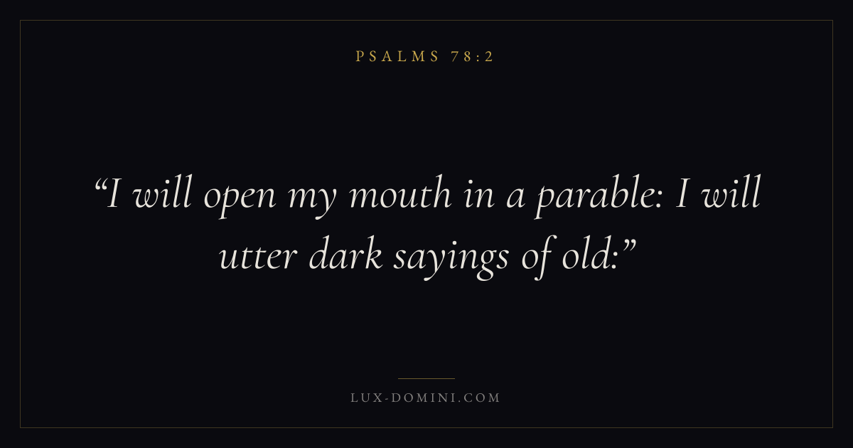 Books / Psalms / Chapter 78 / Verse 2 ← Psalms 78:1 Psalms 78:2 Psalms 78:3 → I will open my mouth in a parable: I will utter dark sayings of old: Download verse card Share on Twitter Share on Facebook Pin it ✦ Key themes FaithPrayerPraiseLament Read with Hebrews 11:1Romans 10:17Matthew 6:9Luke 18:1 Related topics Bible verses about faithBible verses about prayerBible verses about thankfulness and gratitudeBible verses about grief and loss ✦ Psalms Chapter 78 verses V. 1 V. 2 V. 3 V. 4 V. 5 V. 6 V. 7 V. 8 V. 9 V. 10 V. 11 V. 12 V. 13 V. 14 V. 15 V. 16 V. 17 V. 18 V. 19 V. 20 V. 21 V. 22 V. 23 V. 24 V. 25 V. 26 V. 27 V. 28 V. 29 V. 30 V. 31 V. 32 V. 33 V. 34 V. 35 V. 36 V. 37 V. 38 V. 39 V. 40 V. 41 V. 42 V. 43 V. 44 V. 45 V. 46 V. 47 V. 48 V. 49 V. 50 V. 51 V. 52 V. 53 V. 54 V. 55 V. 56 V. 57 V. 58 V. 59 V. 60 V. 61 V. 62 V. 63 V. 64 V. 65 V. 66 V. 67 V. 68 V. 69 V. 70 V. 71 V. 72