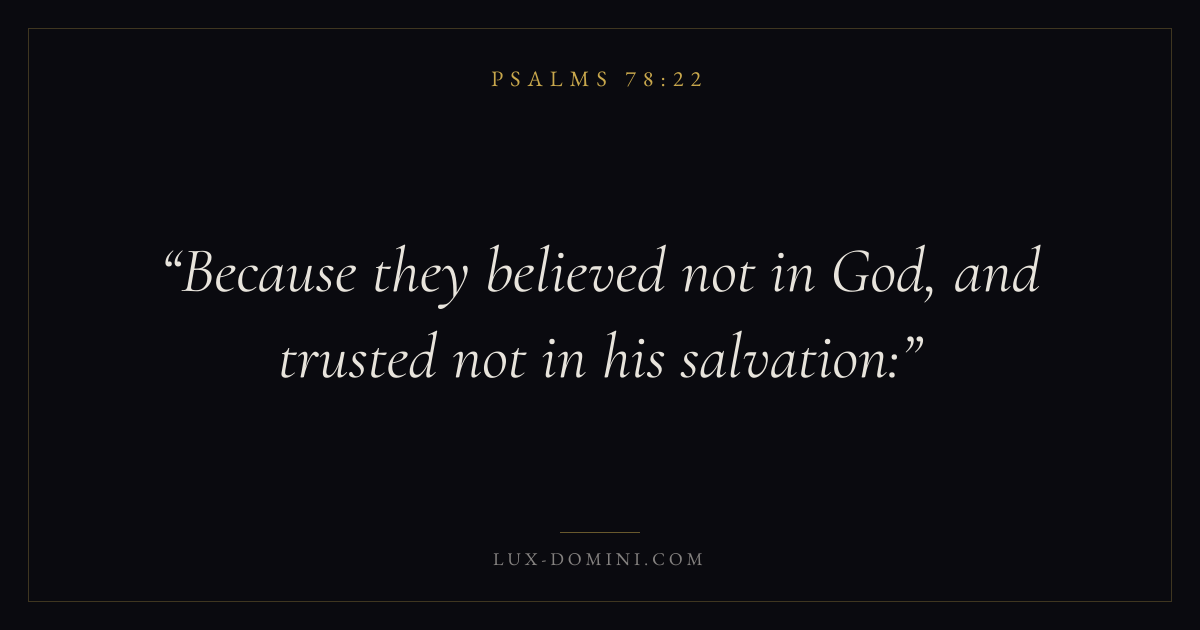 Books / Psalms / Chapter 78 / Verse 22 ← Psalms 78:21 Psalms 78:22 Psalms 78:23 → Because they believed not in God, and trusted not in his salvation: Download verse card Share on Twitter Share on Facebook Pin it ✦ Key themes FaithPrayerSalvationPraise Read with Hebrews 11:1Romans 10:17Matthew 6:9Luke 18:1 Related topics Bible verses about faithBible verses about prayerBible verses about salvationBible verses about thankfulness and gratitude ✦ Psalms Chapter 78 verses V. 1 V. 2 V. 3 V. 4 V. 5 V. 6 V. 7 V. 8 V. 9 V. 10 V. 11 V. 12 V. 13 V. 14 V. 15 V. 16 V. 17 V. 18 V. 19 V. 20 V. 21 V. 22 V. 23 V. 24 V. 25 V. 26 V. 27 V. 28 V. 29 V. 30 V. 31 V. 32 V. 33 V. 34 V. 35 V. 36 V. 37 V. 38 V. 39 V. 40 V. 41 V. 42 V. 43 V. 44 V. 45 V. 46 V. 47 V. 48 V. 49 V. 50 V. 51 V. 52 V. 53 V. 54 V. 55 V. 56 V. 57 V. 58 V. 59 V. 60 V. 61 V. 62 V. 63 V. 64 V. 65 V. 66 V. 67 V. 68 V. 69 V. 70 V. 71 V. 72