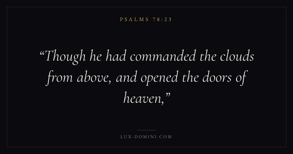 Books / Psalms / Chapter 78 / Verse 23 ← Psalms 78:22 Psalms 78:23 Psalms 78:24 → Though he had commanded the clouds from above, and opened the doors of heaven, Download verse card Share on Twitter Share on Facebook Pin it ✦ Key themes FaithPrayerPraiseLament Read with Hebrews 11:1Romans 10:17Matthew 6:9Luke 18:1 Related topics Bible verses about faithBible verses about prayerBible verses about thankfulness and gratitudeBible verses about grief and loss ✦ Psalms Chapter 78 verses V. 1 V. 2 V. 3 V. 4 V. 5 V. 6 V. 7 V. 8 V. 9 V. 10 V. 11 V. 12 V. 13 V. 14 V. 15 V. 16 V. 17 V. 18 V. 19 V. 20 V. 21 V. 22 V. 23 V. 24 V. 25 V. 26 V. 27 V. 28 V. 29 V. 30 V. 31 V. 32 V. 33 V. 34 V. 35 V. 36 V. 37 V. 38 V. 39 V. 40 V. 41 V. 42 V. 43 V. 44 V. 45 V. 46 V. 47 V. 48 V. 49 V. 50 V. 51 V. 52 V. 53 V. 54 V. 55 V. 56 V. 57 V. 58 V. 59 V. 60 V. 61 V. 62 V. 63 V. 64 V. 65 V. 66 V. 67 V. 68 V. 69 V. 70 V. 71 V. 72