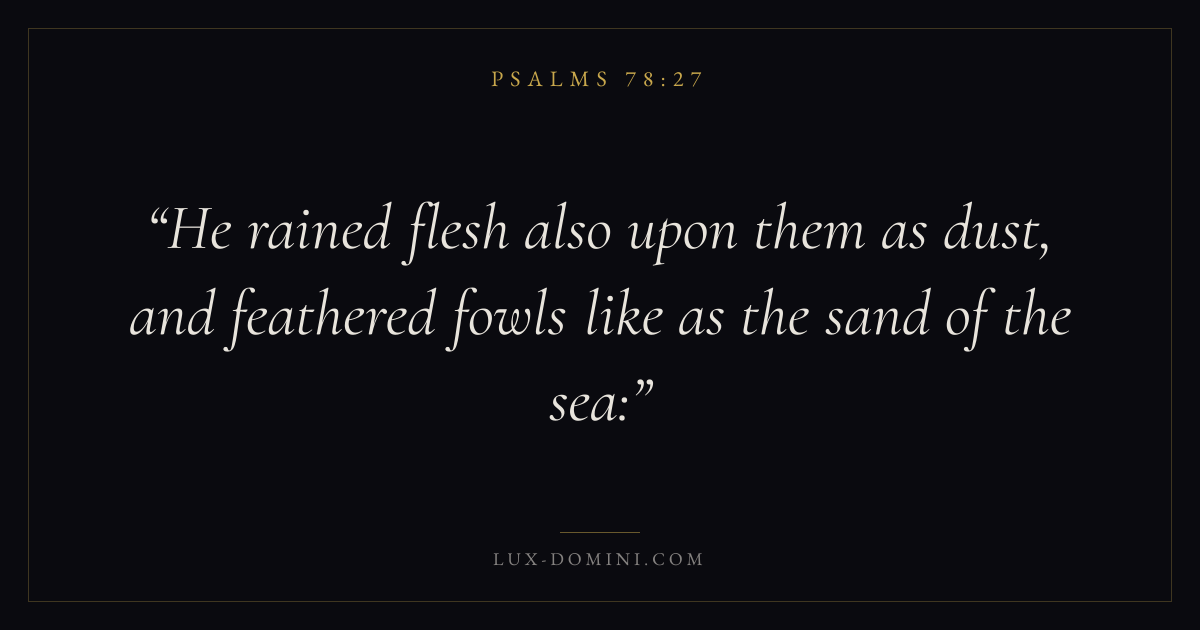 Books / Psalms / Chapter 78 / Verse 27 ← Psalms 78:26 Psalms 78:27 Psalms 78:28 → He rained flesh also upon them as dust, and feathered fowls like as the sand of the sea: Download verse card Share on Twitter Share on Facebook Pin it ✦ Key themes FaithPrayerPraiseLament Read with Hebrews 11:1Romans 10:17Matthew 6:9Luke 18:1 Related topics Bible verses about faithBible verses about prayerBible verses about thankfulness and gratitudeBible verses about grief and loss ✦ Psalms Chapter 78 verses V. 1 V. 2 V. 3 V. 4 V. 5 V. 6 V. 7 V. 8 V. 9 V. 10 V. 11 V. 12 V. 13 V. 14 V. 15 V. 16 V. 17 V. 18 V. 19 V. 20 V. 21 V. 22 V. 23 V. 24 V. 25 V. 26 V. 27 V. 28 V. 29 V. 30 V. 31 V. 32 V. 33 V. 34 V. 35 V. 36 V. 37 V. 38 V. 39 V. 40 V. 41 V. 42 V. 43 V. 44 V. 45 V. 46 V. 47 V. 48 V. 49 V. 50 V. 51 V. 52 V. 53 V. 54 V. 55 V. 56 V. 57 V. 58 V. 59 V. 60 V. 61 V. 62 V. 63 V. 64 V. 65 V. 66 V. 67 V. 68 V. 69 V. 70 V. 71 V. 72