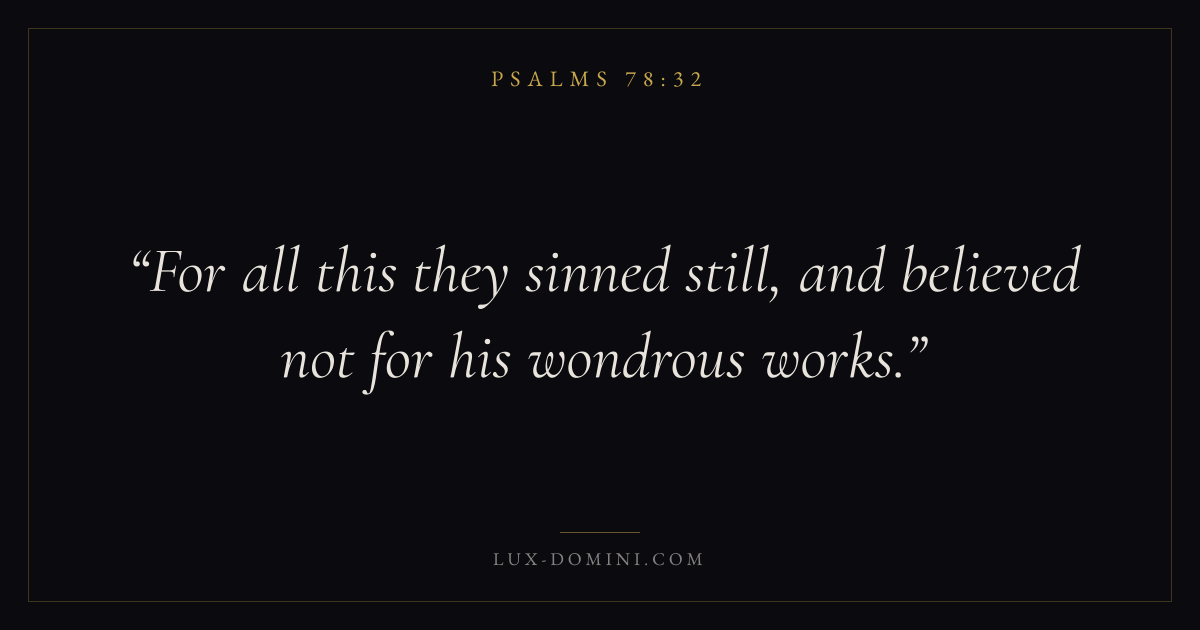 Books / Psalms / Chapter 78 / Verse 32 ← Psalms 78:31 Psalms 78:32 Psalms 78:33 → For all this they sinned still, and believed not for his wondrous works. Download verse card Share on Twitter Share on Facebook Pin it ✦ Key themes FaithPrayerPeacePraise Read with Hebrews 11:1Romans 10:17Matthew 6:9Luke 18:1 Related topics Bible verses about faithBible verses about prayerBible verses about peaceBible verses about thankfulness and gratitude ✦ Psalms Chapter 78 verses V. 1 V. 2 V. 3 V. 4 V. 5 V. 6 V. 7 V. 8 V. 9 V. 10 V. 11 V. 12 V. 13 V. 14 V. 15 V. 16 V. 17 V. 18 V. 19 V. 20 V. 21 V. 22 V. 23 V. 24 V. 25 V. 26 V. 27 V. 28 V. 29 V. 30 V. 31 V. 32 V. 33 V. 34 V. 35 V. 36 V. 37 V. 38 V. 39 V. 40 V. 41 V. 42 V. 43 V. 44 V. 45 V. 46 V. 47 V. 48 V. 49 V. 50 V. 51 V. 52 V. 53 V. 54 V. 55 V. 56 V. 57 V. 58 V. 59 V. 60 V. 61 V. 62 V. 63 V. 64 V. 65 V. 66 V. 67 V. 68 V. 69 V. 70 V. 71 V. 72