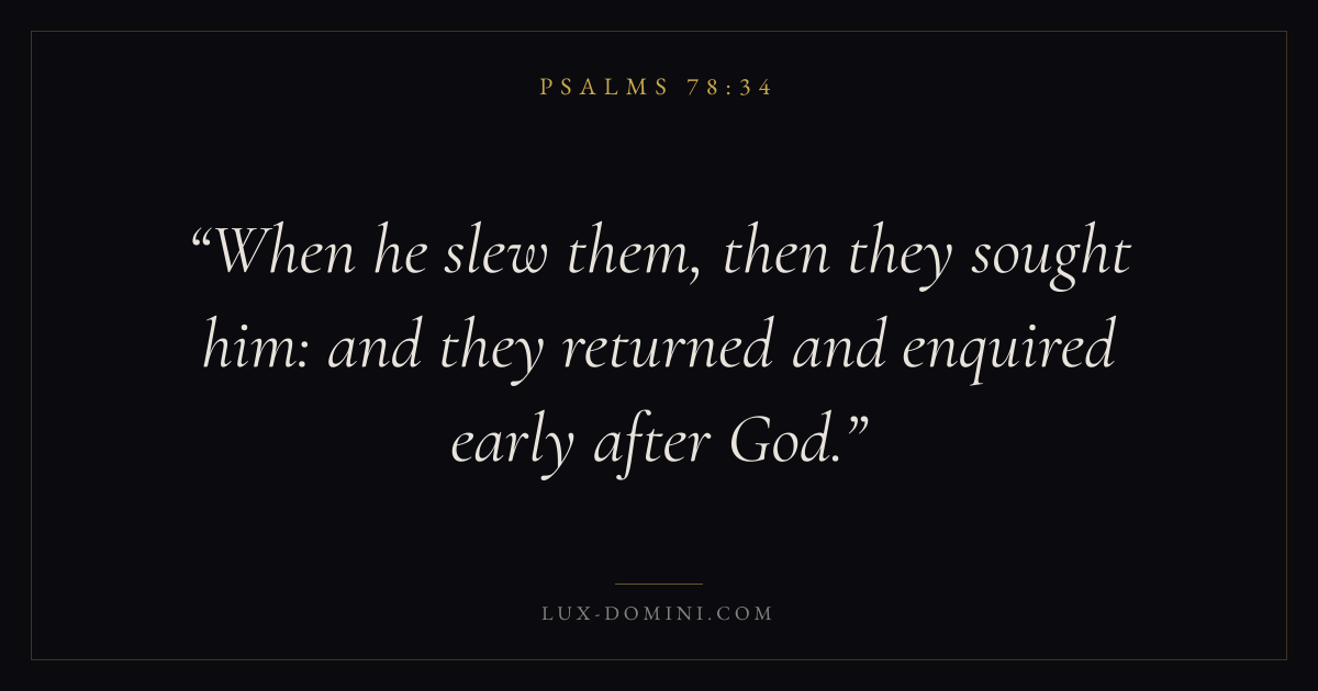 Books / Psalms / Chapter 78 / Verse 34 ← Psalms 78:33 Psalms 78:34 Psalms 78:35 → When he slew them, then they sought him: and they returned and enquired early after God. Download verse card Share on Twitter Share on Facebook Pin it ✦ Key themes FaithPrayerPraiseLament Read with Hebrews 11:1Romans 10:17Matthew 6:9Luke 18:1 Related topics Bible verses about faithBible verses about prayerBible verses about thankfulness and gratitudeBible verses about grief and loss ✦ Psalms Chapter 78 verses V. 1 V. 2 V. 3 V. 4 V. 5 V. 6 V. 7 V. 8 V. 9 V. 10 V. 11 V. 12 V. 13 V. 14 V. 15 V. 16 V. 17 V. 18 V. 19 V. 20 V. 21 V. 22 V. 23 V. 24 V. 25 V. 26 V. 27 V. 28 V. 29 V. 30 V. 31 V. 32 V. 33 V. 34 V. 35 V. 36 V. 37 V. 38 V. 39 V. 40 V. 41 V. 42 V. 43 V. 44 V. 45 V. 46 V. 47 V. 48 V. 49 V. 50 V. 51 V. 52 V. 53 V. 54 V. 55 V. 56 V. 57 V. 58 V. 59 V. 60 V. 61 V. 62 V. 63 V. 64 V. 65 V. 66 V. 67 V. 68 V. 69 V. 70 V. 71 V. 72