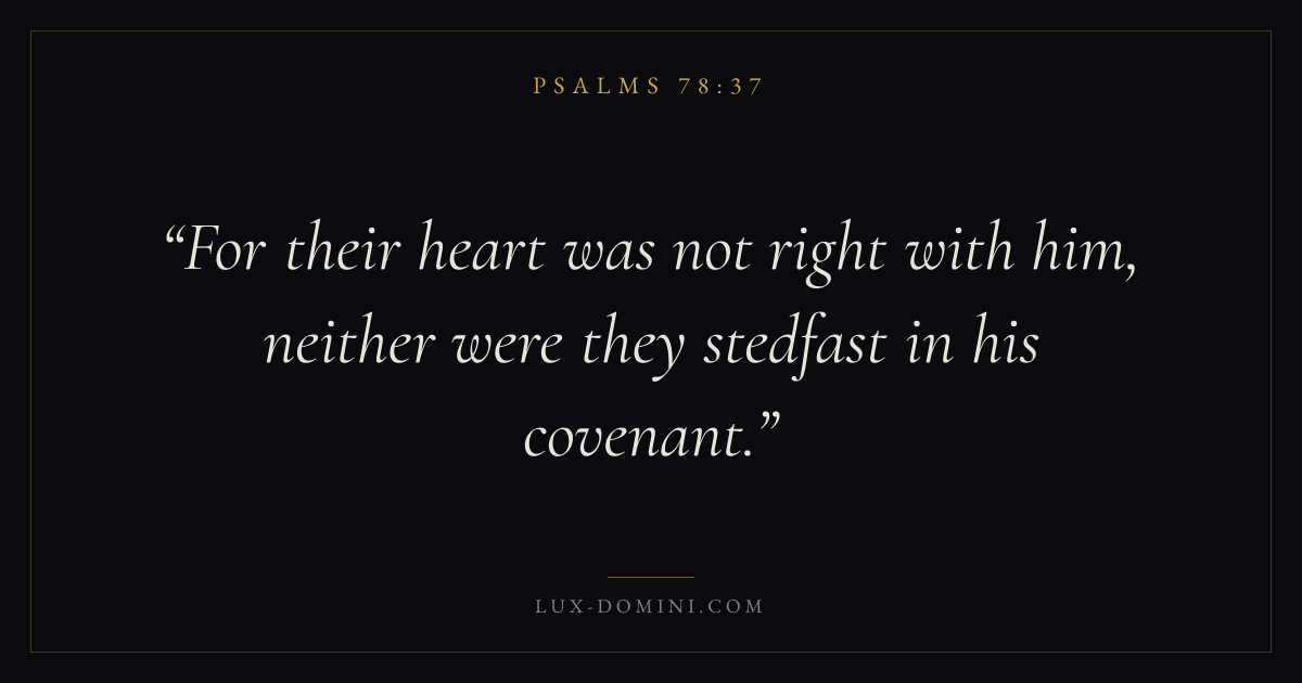 Books / Psalms / Chapter 78 / Verse 37 ← Psalms 78:36 Psalms 78:37 Psalms 78:38 → For their heart was not right with him, neither were they stedfast in his covenant. Download verse card Share on Twitter Share on Facebook Pin it ✦ Key themes FaithPrayerPraiseLament Read with Hebrews 11:1Romans 10:17Matthew 6:9Luke 18:1 Related topics Bible verses about faithBible verses about prayerBible verses about thankfulness and gratitudeBible verses about grief and loss ✦ Psalms Chapter 78 verses V. 1 V. 2 V. 3 V. 4 V. 5 V. 6 V. 7 V. 8 V. 9 V. 10 V. 11 V. 12 V. 13 V. 14 V. 15 V. 16 V. 17 V. 18 V. 19 V. 20 V. 21 V. 22 V. 23 V. 24 V. 25 V. 26 V. 27 V. 28 V. 29 V. 30 V. 31 V. 32 V. 33 V. 34 V. 35 V. 36 V. 37 V. 38 V. 39 V. 40 V. 41 V. 42 V. 43 V. 44 V. 45 V. 46 V. 47 V. 48 V. 49 V. 50 V. 51 V. 52 V. 53 V. 54 V. 55 V. 56 V. 57 V. 58 V. 59 V. 60 V. 61 V. 62 V. 63 V. 64 V. 65 V. 66 V. 67 V. 68 V. 69 V. 70 V. 71 V. 72
