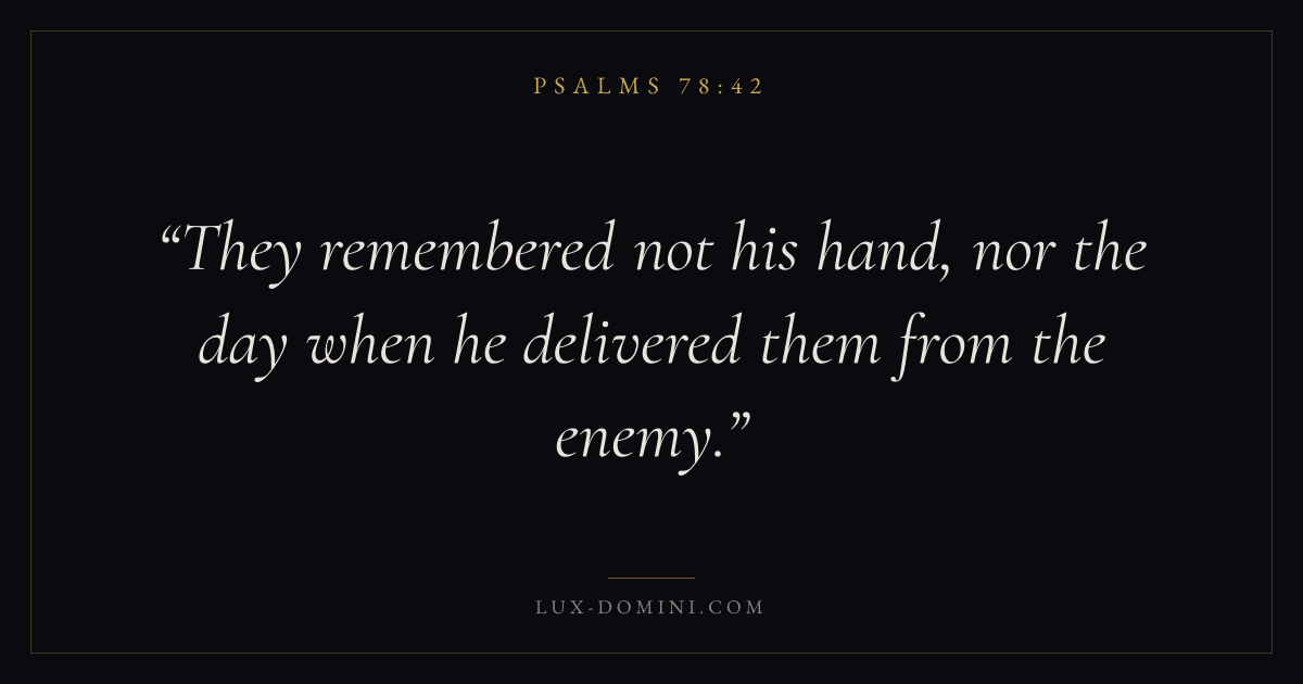 Books / Psalms / Chapter 78 / Verse 42 ← Psalms 78:41 Psalms 78:42 Psalms 78:43 → They remembered not his hand, nor the day when he delivered them from the enemy. Download verse card Share on Twitter Share on Facebook Pin it ✦ Key themes FaithPrayerJustice and mercyPraise Read with Hebrews 11:1Romans 10:17Matthew 6:9Luke 18:1 Related topics Bible verses about faithBible verses about prayerBible verses about justice and mercyBible verses about thankfulness and gratitude ✦ Psalms Chapter 78 verses V. 1 V. 2 V. 3 V. 4 V. 5 V. 6 V. 7 V. 8 V. 9 V. 10 V. 11 V. 12 V. 13 V. 14 V. 15 V. 16 V. 17 V. 18 V. 19 V. 20 V. 21 V. 22 V. 23 V. 24 V. 25 V. 26 V. 27 V. 28 V. 29 V. 30 V. 31 V. 32 V. 33 V. 34 V. 35 V. 36 V. 37 V. 38 V. 39 V. 40 V. 41 V. 42 V. 43 V. 44 V. 45 V. 46 V. 47 V. 48 V. 49 V. 50 V. 51 V. 52 V. 53 V. 54 V. 55 V. 56 V. 57 V. 58 V. 59 V. 60 V. 61 V. 62 V. 63 V. 64 V. 65 V. 66 V. 67 V. 68 V. 69 V. 70 V. 71 V. 72