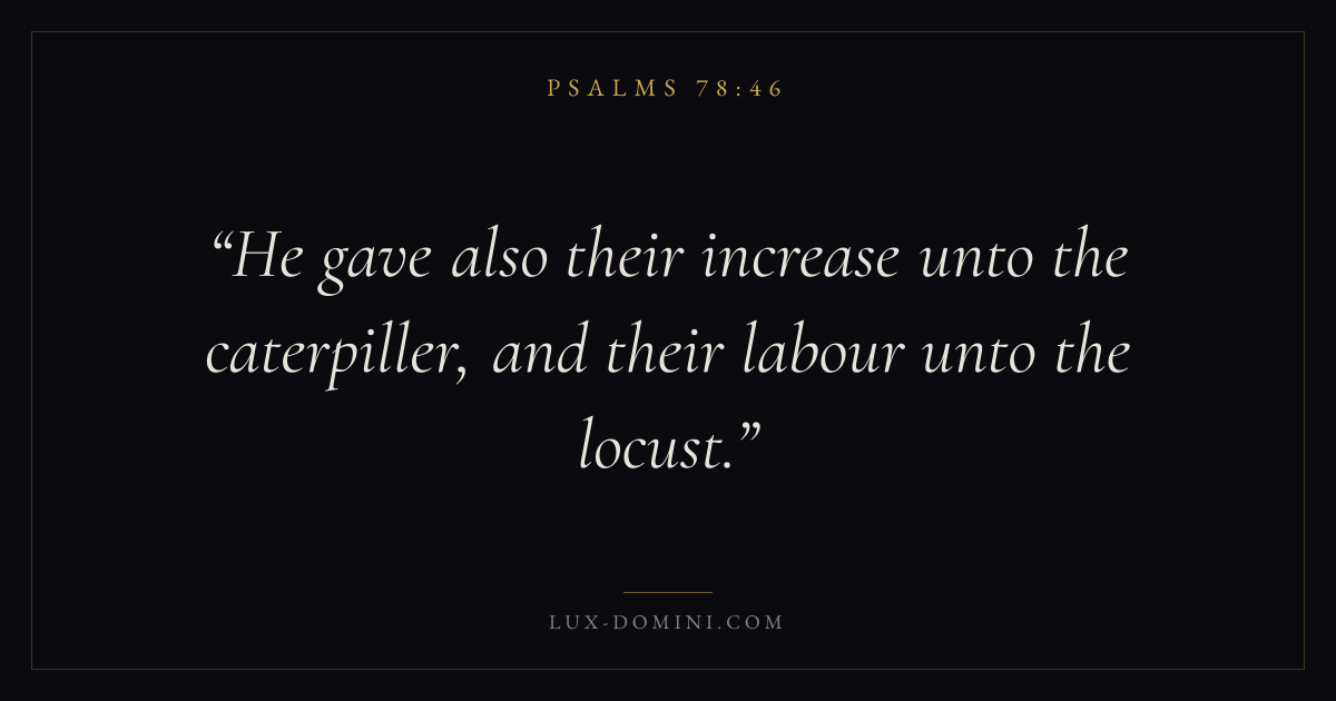 Books / Psalms / Chapter 78 / Verse 46 ← Psalms 78:45 Psalms 78:46 Psalms 78:47 → He gave also their increase unto the caterpiller, and their labour unto the locust. Download verse card Share on Twitter Share on Facebook Pin it ✦ Key themes FaithPrayerJustice and mercyPraise Read with Hebrews 11:1Romans 10:17Matthew 6:9Luke 18:1 Related topics Bible verses about faithBible verses about prayerBible verses about justice and mercyBible verses about thankfulness and gratitude ✦ Psalms Chapter 78 verses V. 1 V. 2 V. 3 V. 4 V. 5 V. 6 V. 7 V. 8 V. 9 V. 10 V. 11 V. 12 V. 13 V. 14 V. 15 V. 16 V. 17 V. 18 V. 19 V. 20 V. 21 V. 22 V. 23 V. 24 V. 25 V. 26 V. 27 V. 28 V. 29 V. 30 V. 31 V. 32 V. 33 V. 34 V. 35 V. 36 V. 37 V. 38 V. 39 V. 40 V. 41 V. 42 V. 43 V. 44 V. 45 V. 46 V. 47 V. 48 V. 49 V. 50 V. 51 V. 52 V. 53 V. 54 V. 55 V. 56 V. 57 V. 58 V. 59 V. 60 V. 61 V. 62 V. 63 V. 64 V. 65 V. 66 V. 67 V. 68 V. 69 V. 70 V. 71 V. 72