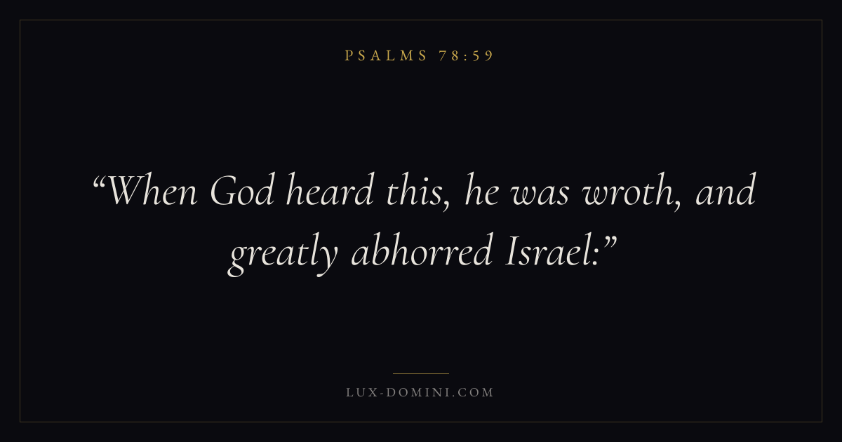 Books / Psalms / Chapter 78 / Verse 59 ← Psalms 78:58 Psalms 78:59 Psalms 78:60 → When God heard this, he was wroth, and greatly abhorred Israel: Download verse card Share on Twitter Share on Facebook Pin it ✦ Key themes FaithPrayerPraiseLament Read with Hebrews 11:1Romans 10:17Matthew 6:9Luke 18:1 Related topics Bible verses about faithBible verses about prayerBible verses about thankfulness and gratitudeBible verses about grief and loss ✦ Psalms Chapter 78 verses V. 1 V. 2 V. 3 V. 4 V. 5 V. 6 V. 7 V. 8 V. 9 V. 10 V. 11 V. 12 V. 13 V. 14 V. 15 V. 16 V. 17 V. 18 V. 19 V. 20 V. 21 V. 22 V. 23 V. 24 V. 25 V. 26 V. 27 V. 28 V. 29 V. 30 V. 31 V. 32 V. 33 V. 34 V. 35 V. 36 V. 37 V. 38 V. 39 V. 40 V. 41 V. 42 V. 43 V. 44 V. 45 V. 46 V. 47 V. 48 V. 49 V. 50 V. 51 V. 52 V. 53 V. 54 V. 55 V. 56 V. 57 V. 58 V. 59 V. 60 V. 61 V. 62 V. 63 V. 64 V. 65 V. 66 V. 67 V. 68 V. 69 V. 70 V. 71 V. 72