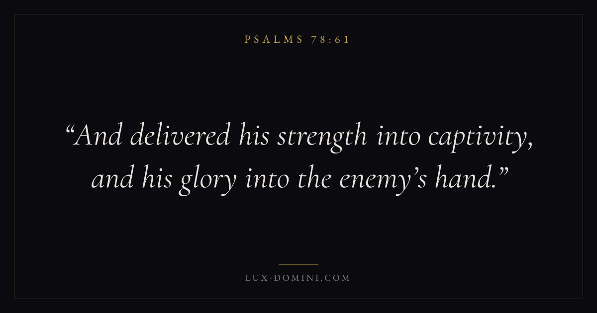 Books / Psalms / Chapter 78 / Verse 61 ← Psalms 78:60 Psalms 78:61 Psalms 78:62 → And delivered his strength into captivity, and his glory into the enemy’s hand. Download verse card Share on Twitter Share on Facebook Pin it ✦ Key themes FaithPrayerPraiseLament Read with Hebrews 11:1Romans 10:17Matthew 6:9Luke 18:1 Related topics Bible verses about faithBible verses about prayerBible verses about thankfulness and gratitudeBible verses about grief and loss ✦ Psalms Chapter 78 verses V. 1 V. 2 V. 3 V. 4 V. 5 V. 6 V. 7 V. 8 V. 9 V. 10 V. 11 V. 12 V. 13 V. 14 V. 15 V. 16 V. 17 V. 18 V. 19 V. 20 V. 21 V. 22 V. 23 V. 24 V. 25 V. 26 V. 27 V. 28 V. 29 V. 30 V. 31 V. 32 V. 33 V. 34 V. 35 V. 36 V. 37 V. 38 V. 39 V. 40 V. 41 V. 42 V. 43 V. 44 V. 45 V. 46 V. 47 V. 48 V. 49 V. 50 V. 51 V. 52 V. 53 V. 54 V. 55 V. 56 V. 57 V. 58 V. 59 V. 60 V. 61 V. 62 V. 63 V. 64 V. 65 V. 66 V. 67 V. 68 V. 69 V. 70 V. 71 V. 72