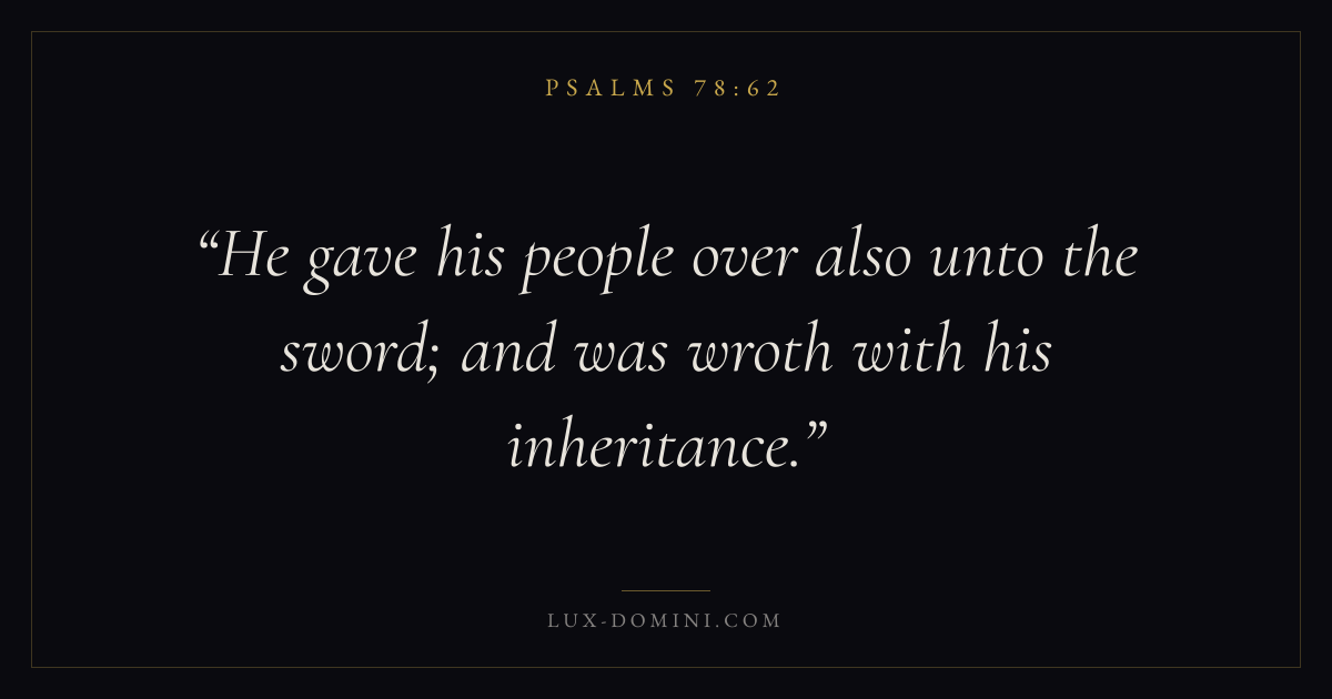 Books / Psalms / Chapter 78 / Verse 62 ← Psalms 78:61 Psalms 78:62 Psalms 78:63 → He gave his people over also unto the sword; and was wroth with his inheritance. Download verse card Share on Twitter Share on Facebook Pin it ✦ Key themes FaithPrayerPraiseLament Read with Hebrews 11:1Romans 10:17Matthew 6:9Luke 18:1 Related topics Bible verses about faithBible verses about prayerBible verses about thankfulness and gratitudeBible verses about grief and loss ✦ Psalms Chapter 78 verses V. 1 V. 2 V. 3 V. 4 V. 5 V. 6 V. 7 V. 8 V. 9 V. 10 V. 11 V. 12 V. 13 V. 14 V. 15 V. 16 V. 17 V. 18 V. 19 V. 20 V. 21 V. 22 V. 23 V. 24 V. 25 V. 26 V. 27 V. 28 V. 29 V. 30 V. 31 V. 32 V. 33 V. 34 V. 35 V. 36 V. 37 V. 38 V. 39 V. 40 V. 41 V. 42 V. 43 V. 44 V. 45 V. 46 V. 47 V. 48 V. 49 V. 50 V. 51 V. 52 V. 53 V. 54 V. 55 V. 56 V. 57 V. 58 V. 59 V. 60 V. 61 V. 62 V. 63 V. 64 V. 65 V. 66 V. 67 V. 68 V. 69 V. 70 V. 71 V. 72