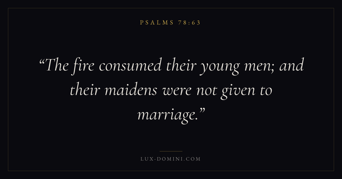 Books / Psalms / Chapter 78 / Verse 63 ← Psalms 78:62 Psalms 78:63 Psalms 78:64 → The fire consumed their young men; and their maidens were not given to marriage. Download verse card Share on Twitter Share on Facebook Pin it ✦ Key themes FaithPrayerPraiseLament Read with Hebrews 11:1Romans 10:17Matthew 6:9Luke 18:1 Related topics Bible verses about faithBible verses about prayerBible verses about thankfulness and gratitudeBible verses about grief and loss ✦ Psalms Chapter 78 verses V. 1 V. 2 V. 3 V. 4 V. 5 V. 6 V. 7 V. 8 V. 9 V. 10 V. 11 V. 12 V. 13 V. 14 V. 15 V. 16 V. 17 V. 18 V. 19 V. 20 V. 21 V. 22 V. 23 V. 24 V. 25 V. 26 V. 27 V. 28 V. 29 V. 30 V. 31 V. 32 V. 33 V. 34 V. 35 V. 36 V. 37 V. 38 V. 39 V. 40 V. 41 V. 42 V. 43 V. 44 V. 45 V. 46 V. 47 V. 48 V. 49 V. 50 V. 51 V. 52 V. 53 V. 54 V. 55 V. 56 V. 57 V. 58 V. 59 V. 60 V. 61 V. 62 V. 63 V. 64 V. 65 V. 66 V. 67 V. 68 V. 69 V. 70 V. 71 V. 72