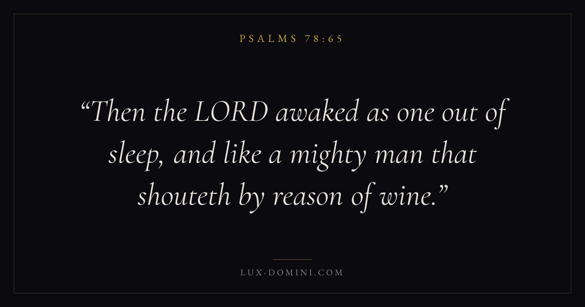 Books / Psalms / Chapter 78 / Verse 65 ← Psalms 78:64 Psalms 78:65 Psalms 78:66 → Then the LORD awaked as one out of sleep, and like a mighty man that shouteth by reason of wine. Download verse card Share on Twitter Share on Facebook Pin it ✦ Key themes FaithPrayerPraiseLament Read with Hebrews 11:1Romans 10:17Matthew 6:9Luke 18:1 Related topics Bible verses about faithBible verses about prayerBible verses about thankfulness and gratitudeBible verses about grief and loss ✦ Psalms Chapter 78 verses V. 1 V. 2 V. 3 V. 4 V. 5 V. 6 V. 7 V. 8 V. 9 V. 10 V. 11 V. 12 V. 13 V. 14 V. 15 V. 16 V. 17 V. 18 V. 19 V. 20 V. 21 V. 22 V. 23 V. 24 V. 25 V. 26 V. 27 V. 28 V. 29 V. 30 V. 31 V. 32 V. 33 V. 34 V. 35 V. 36 V. 37 V. 38 V. 39 V. 40 V. 41 V. 42 V. 43 V. 44 V. 45 V. 46 V. 47 V. 48 V. 49 V. 50 V. 51 V. 52 V. 53 V. 54 V. 55 V. 56 V. 57 V. 58 V. 59 V. 60 V. 61 V. 62 V. 63 V. 64 V. 65 V. 66 V. 67 V. 68 V. 69 V. 70 V. 71 V. 72