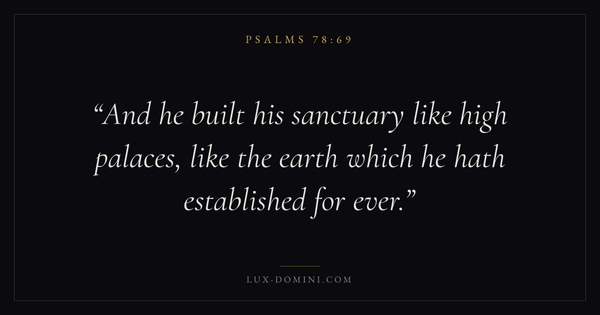 Books / Psalms / Chapter 78 / Verse 69 ← Psalms 78:68 Psalms 78:69 Psalms 78:70 → And he built his sanctuary like high palaces, like the earth which he hath established for ever. Download verse card Share on Twitter Share on Facebook Pin it ✦ Key themes FaithPrayerPraiseLament Read with Hebrews 11:1Romans 10:17Matthew 6:9Luke 18:1 Related topics Bible verses about faithBible verses about prayerBible verses about thankfulness and gratitudeBible verses about grief and loss ✦ Psalms Chapter 78 verses V. 1 V. 2 V. 3 V. 4 V. 5 V. 6 V. 7 V. 8 V. 9 V. 10 V. 11 V. 12 V. 13 V. 14 V. 15 V. 16 V. 17 V. 18 V. 19 V. 20 V. 21 V. 22 V. 23 V. 24 V. 25 V. 26 V. 27 V. 28 V. 29 V. 30 V. 31 V. 32 V. 33 V. 34 V. 35 V. 36 V. 37 V. 38 V. 39 V. 40 V. 41 V. 42 V. 43 V. 44 V. 45 V. 46 V. 47 V. 48 V. 49 V. 50 V. 51 V. 52 V. 53 V. 54 V. 55 V. 56 V. 57 V. 58 V. 59 V. 60 V. 61 V. 62 V. 63 V. 64 V. 65 V. 66 V. 67 V. 68 V. 69 V. 70 V. 71 V. 72
