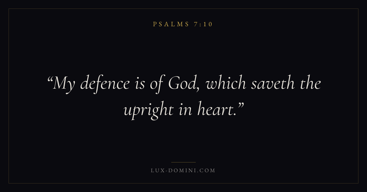 Books / Psalms / Chapter 7 / Verse 10 ← Psalms 7:9 Psalms 7:10 Psalms 7:11 → My defence is of God, which saveth the upright in heart. Download verse card Share on Twitter Share on Facebook Pin it ✦ Key themes FaithPrayerPraiseLament Read with Hebrews 11:1Romans 10:17Matthew 6:9Luke 18:1 Related topics Bible verses about faithBible verses about prayerBible verses about thankfulness and gratitudeBible verses about grief and loss ✦ Psalms Chapter 7 verses V. 1 V. 2 V. 3 V. 4 V. 5 V. 6 V. 7 V. 8 V. 9 V. 10 V. 11 V. 12 V. 13 V. 14 V. 15 V. 16 V. 17