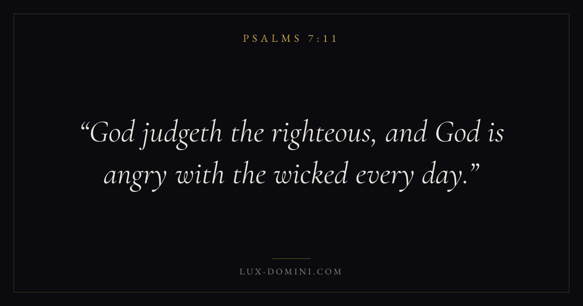Books / Psalms / Chapter 7 / Verse 11 ← Psalms 7:10 Psalms 7:11 Psalms 7:12 → God judgeth the righteous, and God is angry with the wicked every day. Download verse card Share on Twitter Share on Facebook Pin it ✦ Key themes FaithPrayerPraiseLament Read with Hebrews 11:1Romans 10:17Matthew 6:9Luke 18:1 Related topics Bible verses about faithBible verses about prayerBible verses about thankfulness and gratitudeBible verses about grief and loss ✦ Psalms Chapter 7 verses V. 1 V. 2 V. 3 V. 4 V. 5 V. 6 V. 7 V. 8 V. 9 V. 10 V. 11 V. 12 V. 13 V. 14 V. 15 V. 16 V. 17
