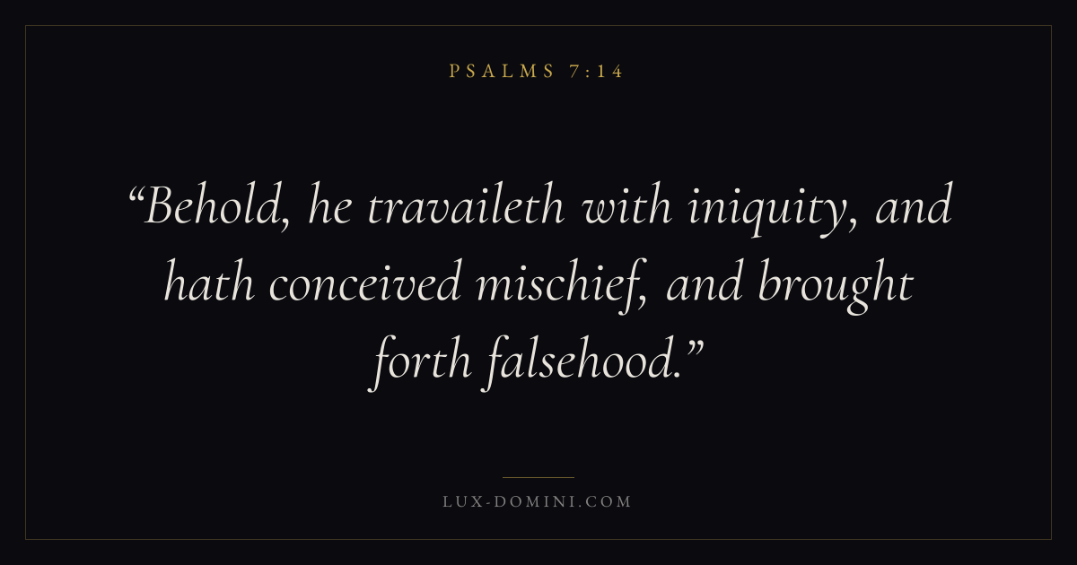 Books / Psalms / Chapter 7 / Verse 14 ← Psalms 7:13 Psalms 7:14 Psalms 7:15 → Behold, he travaileth with iniquity, and hath conceived mischief, and brought forth falsehood. Download verse card Share on Twitter Share on Facebook Pin it ✦ Key themes FaithPrayerPraiseLament Read with Hebrews 11:1Romans 10:17Matthew 6:9Luke 18:1 Related topics Bible verses about faithBible verses about prayerBible verses about thankfulness and gratitudeBible verses about grief and loss ✦ Psalms Chapter 7 verses V. 1 V. 2 V. 3 V. 4 V. 5 V. 6 V. 7 V. 8 V. 9 V. 10 V. 11 V. 12 V. 13 V. 14 V. 15 V. 16 V. 17