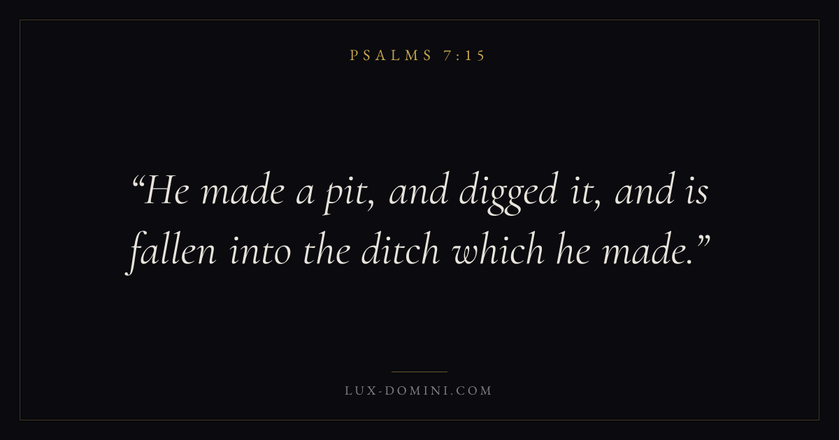 Books / Psalms / Chapter 7 / Verse 15 ← Psalms 7:14 Psalms 7:15 Psalms 7:16 → He made a pit, and digged it, and is fallen into the ditch which he made. Download verse card Share on Twitter Share on Facebook Pin it ✦ Key themes FaithPrayerPraiseLament Read with Hebrews 11:1Romans 10:17Matthew 6:9Luke 18:1 Related topics Bible verses about faithBible verses about prayerBible verses about thankfulness and gratitudeBible verses about grief and loss ✦ Psalms Chapter 7 verses V. 1 V. 2 V. 3 V. 4 V. 5 V. 6 V. 7 V. 8 V. 9 V. 10 V. 11 V. 12 V. 13 V. 14 V. 15 V. 16 V. 17