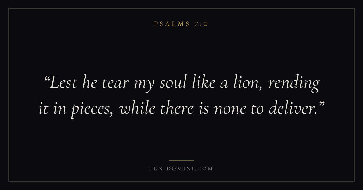 Books / Psalms / Chapter 7 / Verse 2 ← Psalms 7:1 Psalms 7:2 Psalms 7:3 → Lest he tear my soul like a lion, rending it in pieces, while there is none to deliver. Download verse card Share on Twitter Share on Facebook Pin it ✦ Key themes FaithPrayerPraiseLament Read with Hebrews 11:1Romans 10:17Matthew 6:9Luke 18:1 Related topics Bible verses about faithBible verses about prayerBible verses about thankfulness and gratitudeBible verses about grief and loss ✦ Psalms Chapter 7 verses V. 1 V. 2 V. 3 V. 4 V. 5 V. 6 V. 7 V. 8 V. 9 V. 10 V. 11 V. 12 V. 13 V. 14 V. 15 V. 16 V. 17