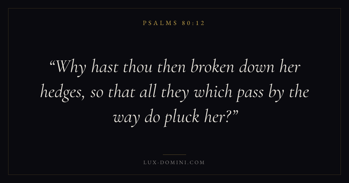 Books / Psalms / Chapter 80 / Verse 12 ← Psalms 80:11 Psalms 80:12 Psalms 80:13 → Why hast thou then broken down her hedges, so that all they which pass by the way do pluck her? Download verse card Share on Twitter Share on Facebook Pin it ✦ Key themes FaithPrayerPraiseLament Read with Hebrews 11:1Romans 10:17Matthew 6:9Luke 18:1 Related topics Bible verses about faithBible verses about prayerBible verses about thankfulness and gratitudeBible verses about grief and loss ✦ Psalms Chapter 80 verses V. 1 V. 2 V. 3 V. 4 V. 5 V. 6 V. 7 V. 8 V. 9 V. 10 V. 11 V. 12 V. 13 V. 14 V. 15 V. 16 V. 17 V. 18 V. 19