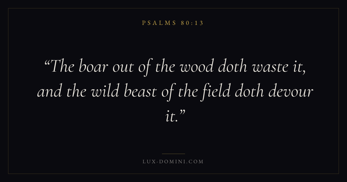 Books / Psalms / Chapter 80 / Verse 13 ← Psalms 80:12 Psalms 80:13 Psalms 80:14 → The boar out of the wood doth waste it, and the wild beast of the field doth devour it. Download verse card Share on Twitter Share on Facebook Pin it ✦ Key themes FaithPrayerPraiseLament Read with Hebrews 11:1Romans 10:17Matthew 6:9Luke 18:1 Related topics Bible verses about faithBible verses about prayerBible verses about thankfulness and gratitudeBible verses about grief and loss ✦ Psalms Chapter 80 verses V. 1 V. 2 V. 3 V. 4 V. 5 V. 6 V. 7 V. 8 V. 9 V. 10 V. 11 V. 12 V. 13 V. 14 V. 15 V. 16 V. 17 V. 18 V. 19