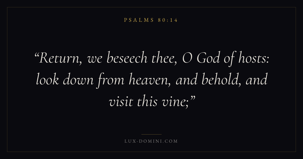 Books / Psalms / Chapter 80 / Verse 14 ← Psalms 80:13 Psalms 80:14 Psalms 80:15 → Return, we beseech thee, O God of hosts: look down from heaven, and behold, and visit this vine; Download verse card Share on Twitter Share on Facebook Pin it ✦ Key themes FaithPrayerPraiseLament Read with Hebrews 11:1Romans 10:17Matthew 6:9Luke 18:1 Related topics Bible verses about faithBible verses about prayerBible verses about thankfulness and gratitudeBible verses about grief and loss ✦ Psalms Chapter 80 verses V. 1 V. 2 V. 3 V. 4 V. 5 V. 6 V. 7 V. 8 V. 9 V. 10 V. 11 V. 12 V. 13 V. 14 V. 15 V. 16 V. 17 V. 18 V. 19