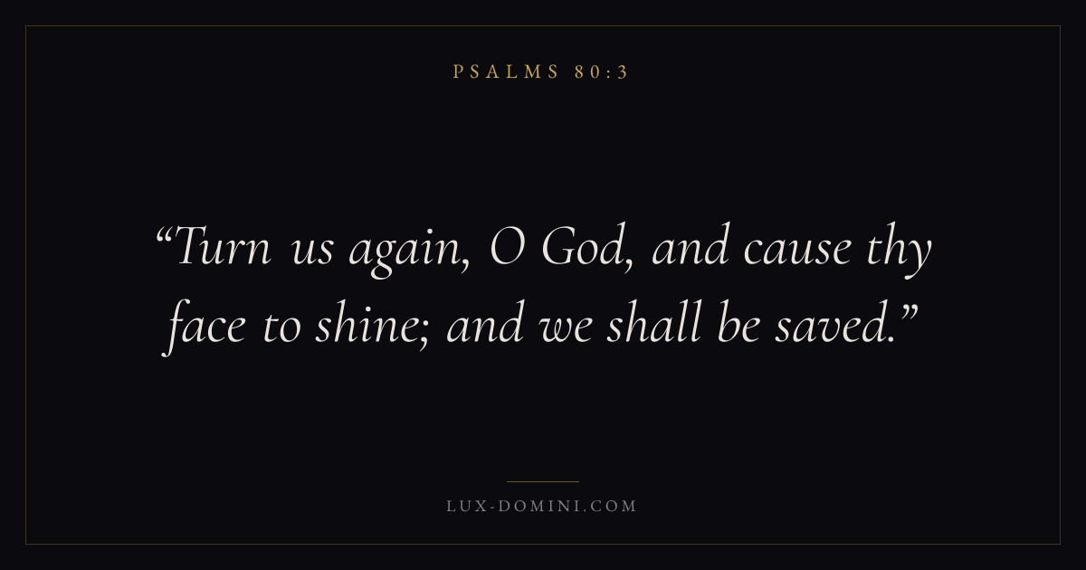 Books / Psalms / Chapter 80 / Verse 3 ← Psalms 80:2 Psalms 80:3 Psalms 80:4 → Turn us again, O God, and cause thy face to shine; and we shall be saved. Download verse card Share on Twitter Share on Facebook Pin it ✦ Key themes LoveFaithPrayerJustice and mercyPraise Read with John 3:161 Corinthians 13:4Hebrews 11:1Romans 10:17 Related topics Bible verses about loveBible verses about faithBible verses about prayerBible verses about justice and mercyBible verses about thankfulness and gratitude ✦ Psalms Chapter 80 verses V. 1 V. 2 V. 3 V. 4 V. 5 V. 6 V. 7 V. 8 V. 9 V. 10 V. 11 V. 12 V. 13 V. 14 V. 15 V. 16 V. 17 V. 18 V. 19