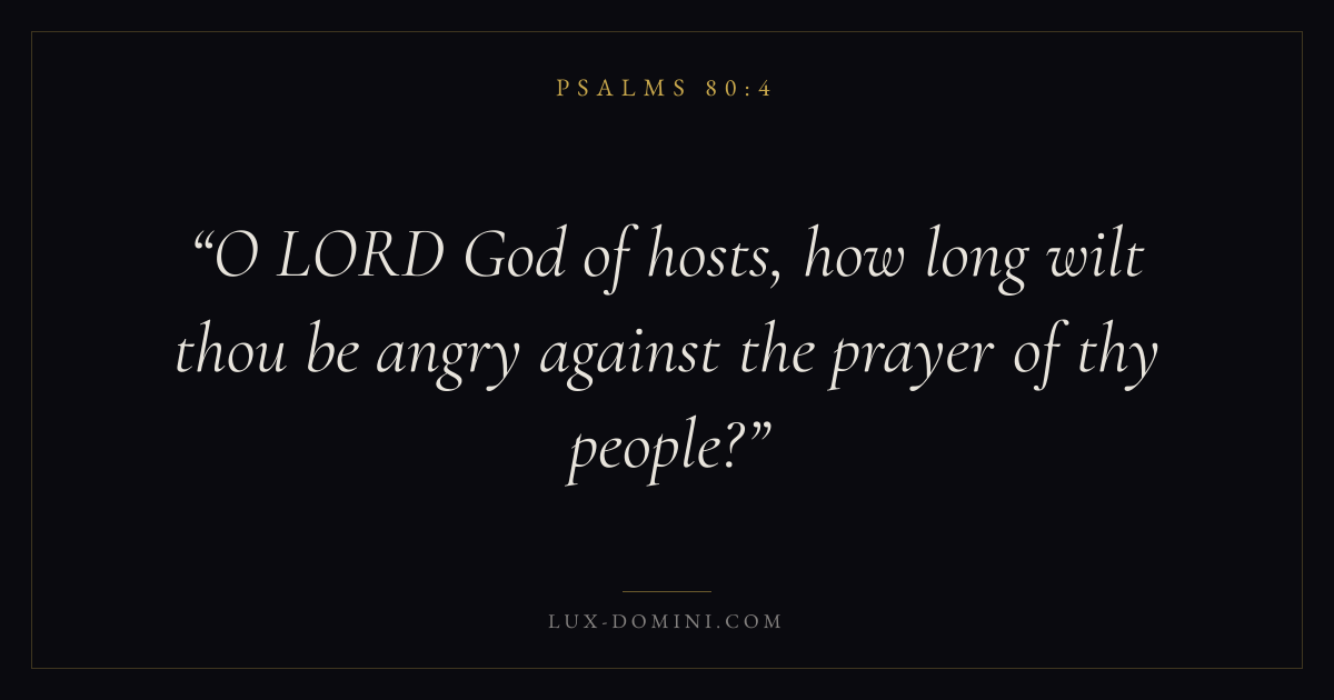 Books / Psalms / Chapter 80 / Verse 4 ← Psalms 80:3 Psalms 80:4 Psalms 80:5 → O LORD God of hosts, how long wilt thou be angry against the prayer of thy people? Download verse card Share on Twitter Share on Facebook Pin it ✦ Key themes LoveFaithPrayerJustice and mercyPraise Read with John 3:161 Corinthians 13:4Hebrews 11:1Romans 10:17 Related topics Bible verses about loveBible verses about faithBible verses about prayerBible verses about justice and mercyBible verses about thankfulness and gratitude ✦ Psalms Chapter 80 verses V. 1 V. 2 V. 3 V. 4 V. 5 V. 6 V. 7 V. 8 V. 9 V. 10 V. 11 V. 12 V. 13 V. 14 V. 15 V. 16 V. 17 V. 18 V. 19