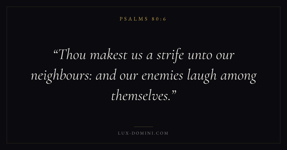 Books / Psalms / Chapter 80 / Verse 6 ← Psalms 80:5 Psalms 80:6 Psalms 80:7 → Thou makest us a strife unto our neighbours: and our enemies laugh among themselves. Download verse card Share on Twitter Share on Facebook Pin it ✦ Key themes LoveFaithPrayerJustice and mercyPraise Read with John 3:161 Corinthians 13:4Hebrews 11:1Romans 10:17 Related topics Bible verses about loveBible verses about faithBible verses about prayerBible verses about justice and mercyBible verses about thankfulness and gratitude ✦ Psalms Chapter 80 verses V. 1 V. 2 V. 3 V. 4 V. 5 V. 6 V. 7 V. 8 V. 9 V. 10 V. 11 V. 12 V. 13 V. 14 V. 15 V. 16 V. 17 V. 18 V. 19