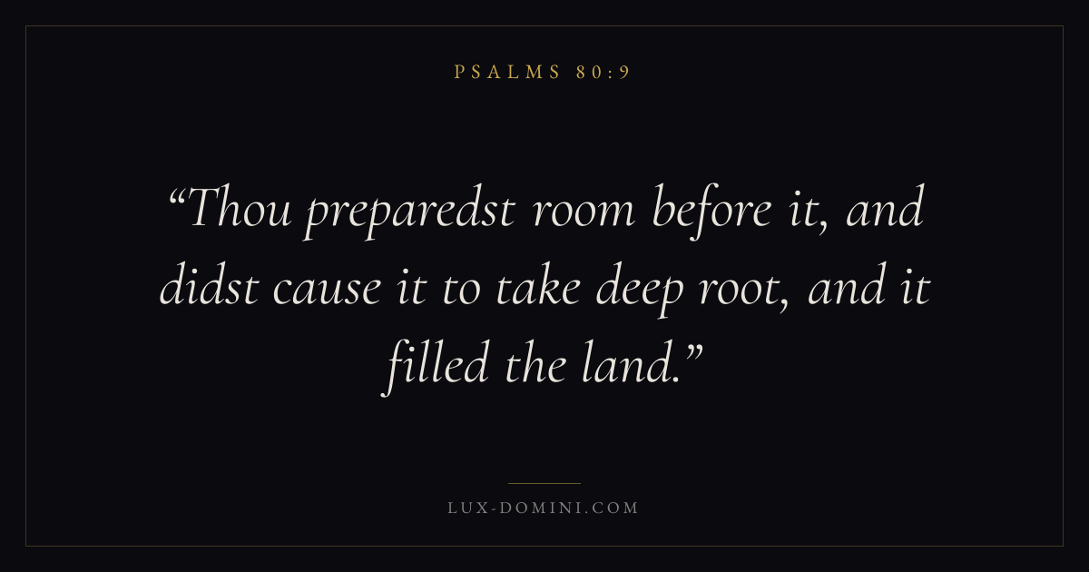 Books / Psalms / Chapter 80 / Verse 9 ← Psalms 80:8 Psalms 80:9 Psalms 80:10 → Thou preparedst room before it, and didst cause it to take deep root, and it filled the land. Download verse card Share on Twitter Share on Facebook Pin it ✦ Key themes FaithPrayerPraiseLament Read with Hebrews 11:1Romans 10:17Matthew 6:9Luke 18:1 Related topics Bible verses about faithBible verses about prayerBible verses about thankfulness and gratitudeBible verses about grief and loss ✦ Psalms Chapter 80 verses V. 1 V. 2 V. 3 V. 4 V. 5 V. 6 V. 7 V. 8 V. 9 V. 10 V. 11 V. 12 V. 13 V. 14 V. 15 V. 16 V. 17 V. 18 V. 19