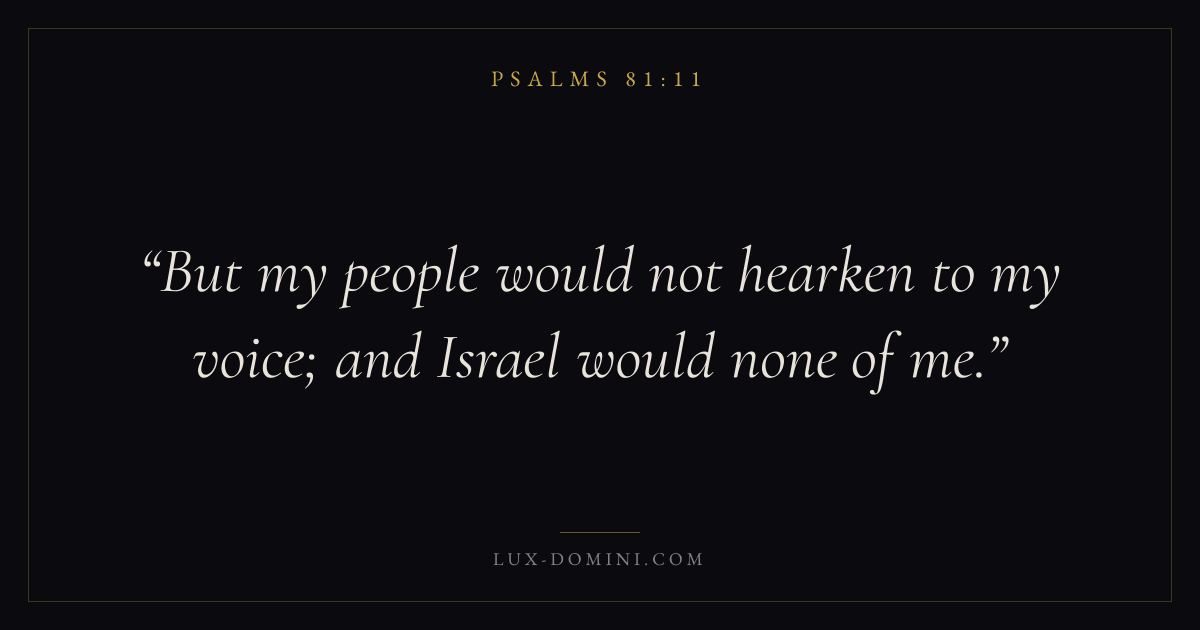 Books / Psalms / Chapter 81 / Verse 11 ← Psalms 81:10 Psalms 81:11 Psalms 81:12 → But my people would not hearken to my voice; and Israel would none of me. Download verse card Share on Twitter Share on Facebook Pin it ✦ Key themes FaithPrayerPraiseLament Read with Hebrews 11:1Romans 10:17Matthew 6:9Luke 18:1 Related topics Bible verses about faithBible verses about prayerBible verses about thankfulness and gratitudeBible verses about grief and loss ✦ Psalms Chapter 81 verses V. 1 V. 2 V. 3 V. 4 V. 5 V. 6 V. 7 V. 8 V. 9 V. 10 V. 11 V. 12 V. 13 V. 14 V. 15 V. 16