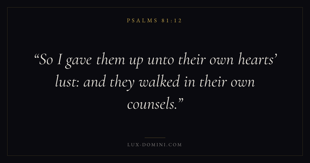 Books / Psalms / Chapter 81 / Verse 12 ← Psalms 81:11 Psalms 81:12 Psalms 81:13 → So I gave them up unto their own hearts’ lust: and they walked in their own counsels. Download verse card Share on Twitter Share on Facebook Pin it ✦ Key themes FaithPrayerPraiseLament Read with Hebrews 11:1Romans 10:17Matthew 6:9Luke 18:1 Related topics Bible verses about faithBible verses about prayerBible verses about thankfulness and gratitudeBible verses about grief and loss ✦ Psalms Chapter 81 verses V. 1 V. 2 V. 3 V. 4 V. 5 V. 6 V. 7 V. 8 V. 9 V. 10 V. 11 V. 12 V. 13 V. 14 V. 15 V. 16