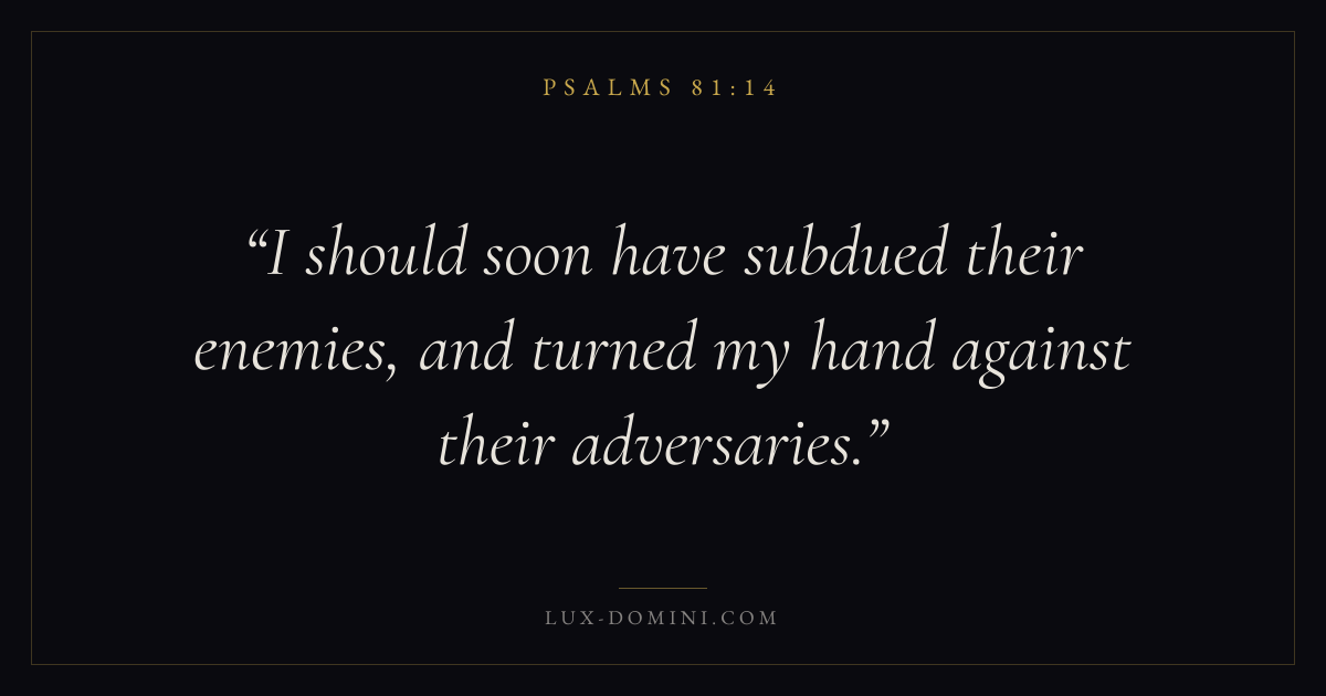 Books / Psalms / Chapter 81 / Verse 14 ← Psalms 81:13 Psalms 81:14 Psalms 81:15 → I should soon have subdued their enemies, and turned my hand against their adversaries. Download verse card Share on Twitter Share on Facebook Pin it ✦ Key themes FaithPrayerPraiseLament Read with Hebrews 11:1Romans 10:17Matthew 6:9Luke 18:1 Related topics Bible verses about faithBible verses about prayerBible verses about thankfulness and gratitudeBible verses about grief and loss ✦ Psalms Chapter 81 verses V. 1 V. 2 V. 3 V. 4 V. 5 V. 6 V. 7 V. 8 V. 9 V. 10 V. 11 V. 12 V. 13 V. 14 V. 15 V. 16