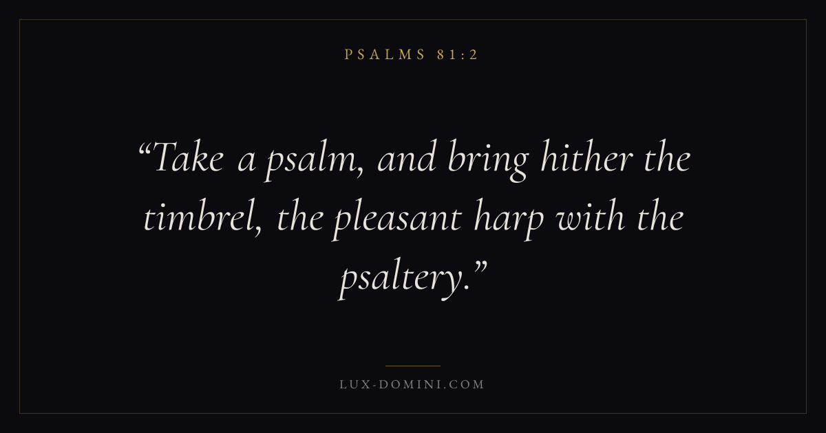 Books / Psalms / Chapter 81 / Verse 2 ← Psalms 81:1 Psalms 81:2 Psalms 81:3 → Take a psalm, and bring hither the timbrel, the pleasant harp with the psaltery. Download verse card Share on Twitter Share on Facebook Pin it ✦ Key themes FaithPrayerPraiseLament Read with Hebrews 11:1Romans 10:17Matthew 6:9Luke 18:1 Related topics Bible verses about faithBible verses about prayerBible verses about thankfulness and gratitudeBible verses about grief and loss ✦ Psalms Chapter 81 verses V. 1 V. 2 V. 3 V. 4 V. 5 V. 6 V. 7 V. 8 V. 9 V. 10 V. 11 V. 12 V. 13 V. 14 V. 15 V. 16