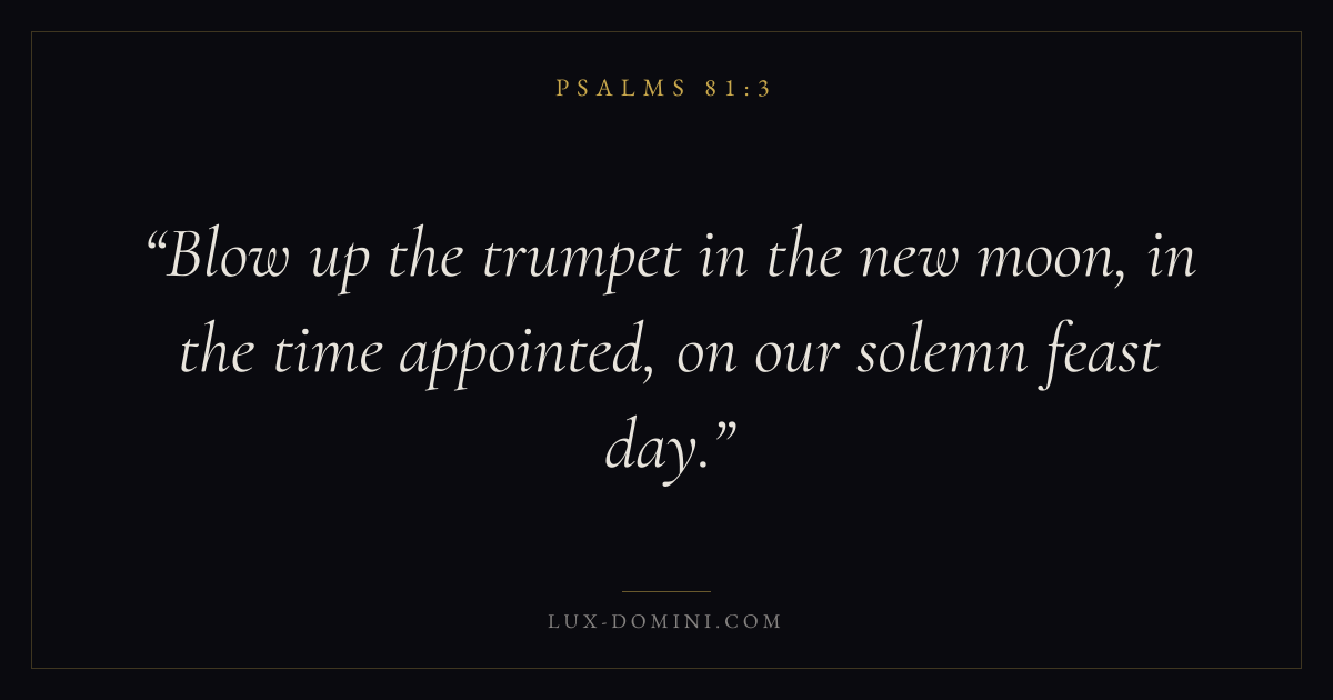 Books / Psalms / Chapter 81 / Verse 3 ← Psalms 81:2 Psalms 81:3 Psalms 81:4 → Blow up the trumpet in the new moon, in the time appointed, on our solemn feast day. Download verse card Share on Twitter Share on Facebook Pin it ✦ Key themes FaithPrayerPraiseLament Read with Hebrews 11:1Romans 10:17Matthew 6:9Luke 18:1 Related topics Bible verses about faithBible verses about prayerBible verses about thankfulness and gratitudeBible verses about grief and loss ✦ Psalms Chapter 81 verses V. 1 V. 2 V. 3 V. 4 V. 5 V. 6 V. 7 V. 8 V. 9 V. 10 V. 11 V. 12 V. 13 V. 14 V. 15 V. 16