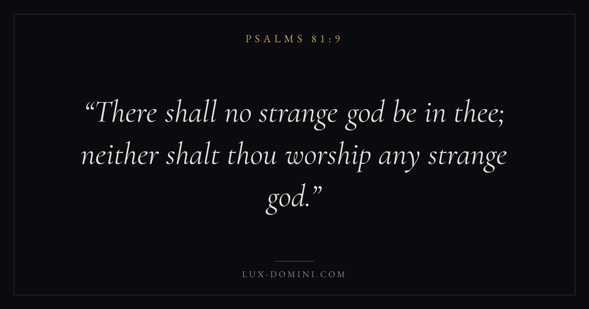 Books / Psalms / Chapter 81 / Verse 9 ← Psalms 81:8 Psalms 81:9 Psalms 81:10 → There shall no strange god be in thee; neither shalt thou worship any strange god. Download verse card Share on Twitter Share on Facebook Pin it ✦ Key themes FaithPrayerPraiseLament Read with Hebrews 11:1Romans 10:17Matthew 6:9Luke 18:1 Related topics Bible verses about faithBible verses about prayerBible verses about thankfulness and gratitudeBible verses about grief and loss ✦ Psalms Chapter 81 verses V. 1 V. 2 V. 3 V. 4 V. 5 V. 6 V. 7 V. 8 V. 9 V. 10 V. 11 V. 12 V. 13 V. 14 V. 15 V. 16