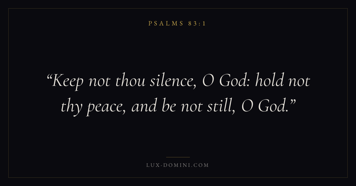 Books / Psalms / Chapter 83 / Verse 1 ← Psalms 82:8 Psalms 83:1 Psalms 83:2 → Keep not thou silence, O God: hold not thy peace, and be not still, O God. Download verse card Share on Twitter Share on Facebook Pin it ✦ Key themes FaithPrayerPeacePraise Read with Hebrews 11:1Romans 10:17Matthew 6:9Luke 18:1 Related topics Bible verses about faithBible verses about prayerBible verses about peaceBible verses about thankfulness and gratitude ✦ Psalms Chapter 83 verses V. 1 V. 2 V. 3 V. 4 V. 5 V. 6 V. 7 V. 8 V. 9 V. 10 V. 11 V. 12 V. 13 V. 14 V. 15 V. 16 V. 17 V. 18