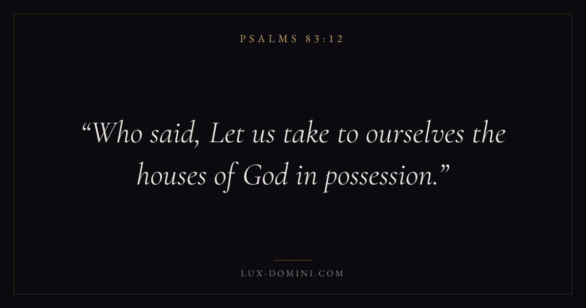 Books / Psalms / Chapter 83 / Verse 12 ← Psalms 83:11 Psalms 83:12 Psalms 83:13 → Who said, Let us take to ourselves the houses of God in possession. Download verse card Share on Twitter Share on Facebook Pin it ✦ Key themes FaithPrayerPeacePraise Read with Hebrews 11:1Romans 10:17Matthew 6:9Luke 18:1 Related topics Bible verses about faithBible verses about prayerBible verses about peaceBible verses about thankfulness and gratitude ✦ Psalms Chapter 83 verses V. 1 V. 2 V. 3 V. 4 V. 5 V. 6 V. 7 V. 8 V. 9 V. 10 V. 11 V. 12 V. 13 V. 14 V. 15 V. 16 V. 17 V. 18