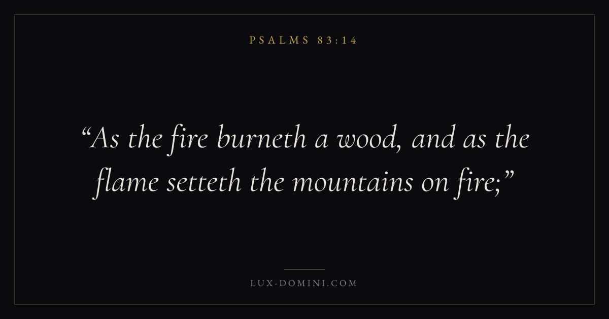 Books / Psalms / Chapter 83 / Verse 14 ← Psalms 83:13 Psalms 83:14 Psalms 83:15 → As the fire burneth a wood, and as the flame setteth the mountains on fire; Download verse card Share on Twitter Share on Facebook Pin it ✦ Key themes FaithPrayerPeacePraise Read with Hebrews 11:1Romans 10:17Matthew 6:9Luke 18:1 Related topics Bible verses about faithBible verses about prayerBible verses about peaceBible verses about thankfulness and gratitude ✦ Psalms Chapter 83 verses V. 1 V. 2 V. 3 V. 4 V. 5 V. 6 V. 7 V. 8 V. 9 V. 10 V. 11 V. 12 V. 13 V. 14 V. 15 V. 16 V. 17 V. 18