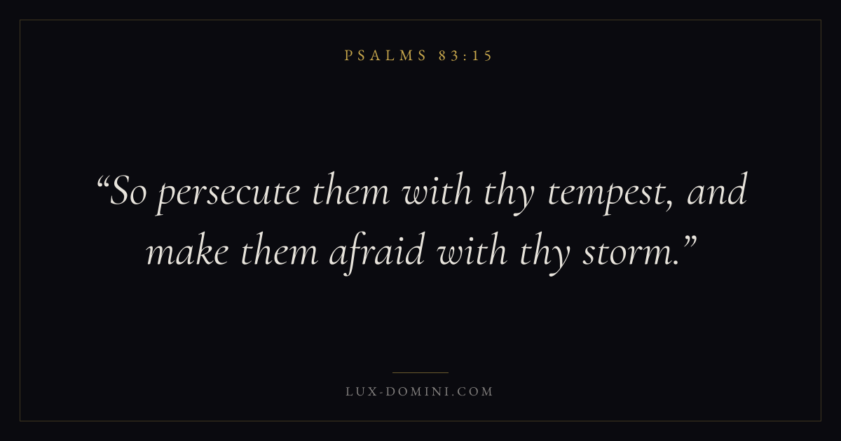 Books / Psalms / Chapter 83 / Verse 15 ← Psalms 83:14 Psalms 83:15 Psalms 83:16 → So persecute them with thy tempest, and make them afraid with thy storm. Download verse card Share on Twitter Share on Facebook Pin it ✦ Key themes FaithAnxiety and fearPrayerPeacePraise Read with Hebrews 11:1Romans 10:17Philippians 4:6Isaiah 41:10 Related topics Bible verses about faithBible verses about anxiety and fearBible verses about prayerBible verses about peaceBible verses about thankfulness and gratitude ✦ Psalms Chapter 83 verses V. 1 V. 2 V. 3 V. 4 V. 5 V. 6 V. 7 V. 8 V. 9 V. 10 V. 11 V. 12 V. 13 V. 14 V. 15 V. 16 V. 17 V. 18