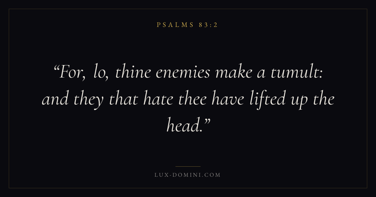 Books / Psalms / Chapter 83 / Verse 2 ← Psalms 83:1 Psalms 83:2 Psalms 83:3 → For, lo, thine enemies make a tumult: and they that hate thee have lifted up the head. Download verse card Share on Twitter Share on Facebook Pin it ✦ Key themes FaithPrayerPraiseLament Read with Hebrews 11:1Romans 10:17Matthew 6:9Luke 18:1 Related topics Bible verses about faithBible verses about prayerBible verses about thankfulness and gratitudeBible verses about grief and loss ✦ Psalms Chapter 83 verses V. 1 V. 2 V. 3 V. 4 V. 5 V. 6 V. 7 V. 8 V. 9 V. 10 V. 11 V. 12 V. 13 V. 14 V. 15 V. 16 V. 17 V. 18