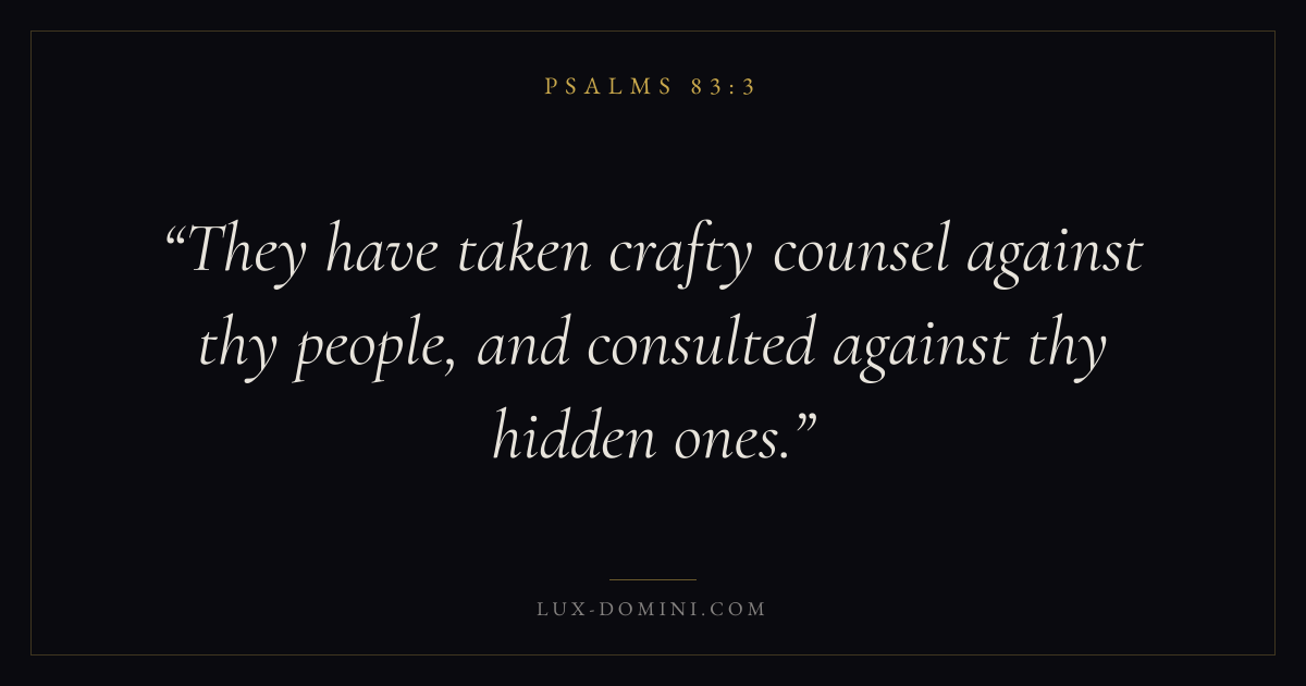 Books / Psalms / Chapter 83 / Verse 3 ← Psalms 83:2 Psalms 83:3 Psalms 83:4 → They have taken crafty counsel against thy people, and consulted against thy hidden ones. Download verse card Share on Twitter Share on Facebook Pin it ✦ Key themes FaithPrayerPraiseLament Read with Hebrews 11:1Romans 10:17Matthew 6:9Luke 18:1 Related topics Bible verses about faithBible verses about prayerBible verses about thankfulness and gratitudeBible verses about grief and loss ✦ Psalms Chapter 83 verses V. 1 V. 2 V. 3 V. 4 V. 5 V. 6 V. 7 V. 8 V. 9 V. 10 V. 11 V. 12 V. 13 V. 14 V. 15 V. 16 V. 17 V. 18