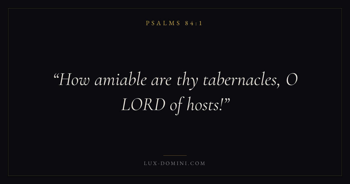Books / Psalms / Chapter 84 / Verse 1 ← Psalms 83:18 Psalms 84:1 Psalms 84:2 → How amiable are thy tabernacles, O LORD of hosts! Download verse card Share on Twitter Share on Facebook Pin it ✦ Key themes FaithPrayerPraiseLament Read with Hebrews 11:1Romans 10:17Matthew 6:9Luke 18:1 Related topics Bible verses about faithBible verses about prayerBible verses about thankfulness and gratitudeBible verses about grief and loss ✦ Psalms Chapter 84 verses V. 1 V. 2 V. 3 V. 4 V. 5 V. 6 V. 7 V. 8 V. 9 V. 10 V. 11 V. 12