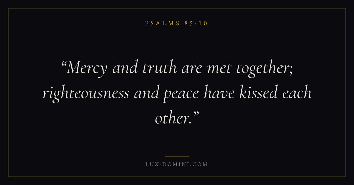 Books / Psalms / Chapter 85 / Verse 10 ← Psalms 85:9 Psalms 85:10 Psalms 85:11 → Mercy and truth are met together; righteousness and peace have kissed each other. Download verse card Share on Twitter Share on Facebook Pin it ✦ Key themes FaithPrayerJustice and mercyPeacePraise Read with Hebrews 11:1Romans 10:17Matthew 6:9Luke 18:1 Related topics Bible verses about faithBible verses about prayerBible verses about justice and mercyBible verses about peaceBible verses about thankfulness and gratitude ✦ Psalms Chapter 85 verses V. 1 V. 2 V. 3 V. 4 V. 5 V. 6 V. 7 V. 8 V. 9 V. 10 V. 11 V. 12 V. 13