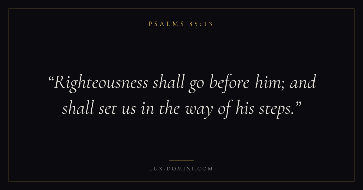 Books / Psalms / Chapter 85 / Verse 13 ← Psalms 85:12 Psalms 85:13 Psalms 86:1 → Righteousness shall go before him; and shall set us in the way of his steps. Download verse card Share on Twitter Share on Facebook Pin it ✦ Key themes FaithPrayerPeacePraise Read with Hebrews 11:1Romans 10:17Matthew 6:9Luke 18:1 Related topics Bible verses about faithBible verses about prayerBible verses about peaceBible verses about thankfulness and gratitude ✦ Psalms Chapter 85 verses V. 1 V. 2 V. 3 V. 4 V. 5 V. 6 V. 7 V. 8 V. 9 V. 10 V. 11 V. 12 V. 13