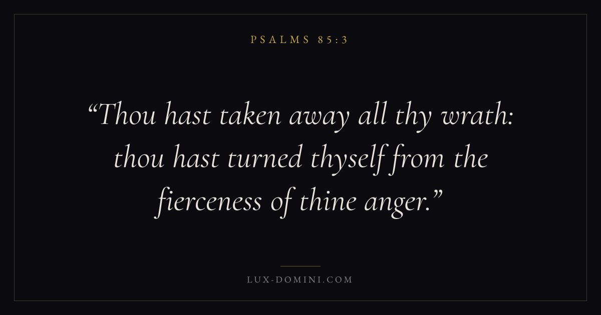 Books / Psalms / Chapter 85 / Verse 3 ← Psalms 85:2 Psalms 85:3 Psalms 85:4 → Thou hast taken away all thy wrath: thou hast turned thyself from the fierceness of thine anger. Download verse card Share on Twitter Share on Facebook Pin it ✦ Key themes FaithPrayerPraiseLament Read with Hebrews 11:1Romans 10:17Matthew 6:9Luke 18:1 Related topics Bible verses about faithBible verses about prayerBible verses about thankfulness and gratitudeBible verses about grief and loss ✦ Psalms Chapter 85 verses V. 1 V. 2 V. 3 V. 4 V. 5 V. 6 V. 7 V. 8 V. 9 V. 10 V. 11 V. 12 V. 13