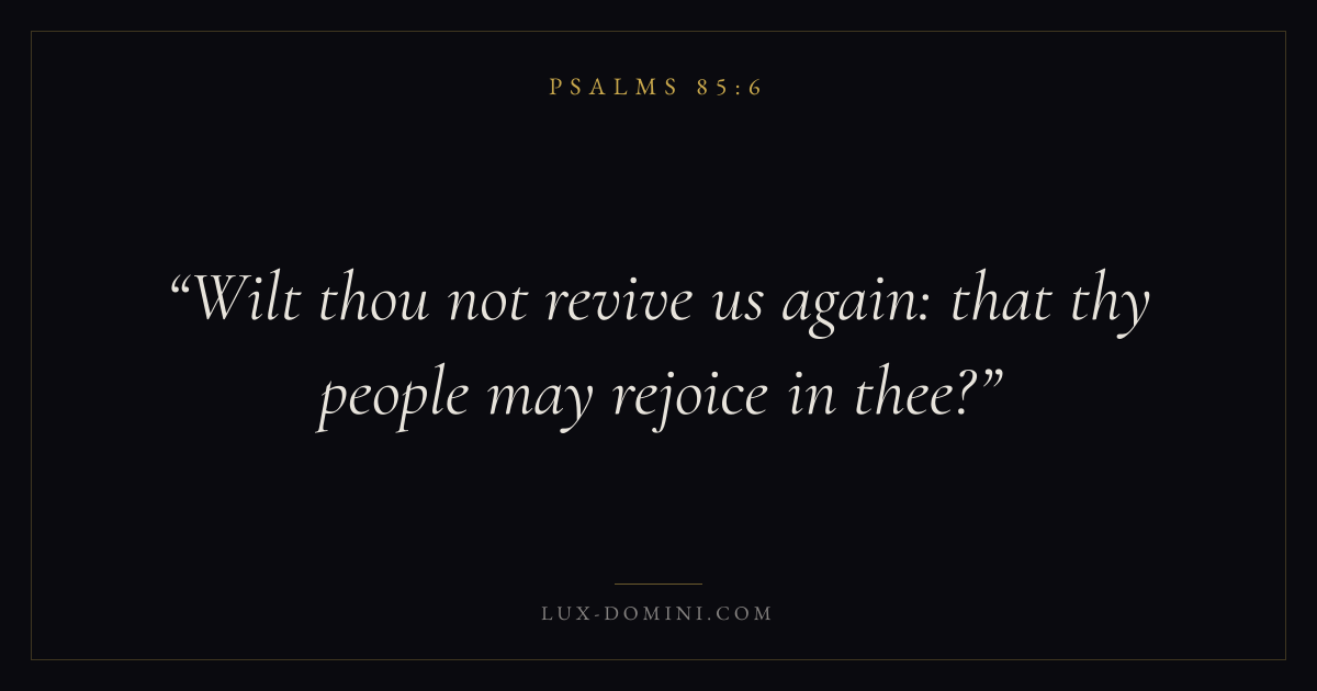 Books / Psalms / Chapter 85 / Verse 6 ← Psalms 85:5 Psalms 85:6 Psalms 85:7 → Wilt thou not revive us again: that thy people may rejoice in thee? Download verse card Share on Twitter Share on Facebook Pin it ✦ Key themes FaithPrayerPraiseLament Read with Hebrews 11:1Romans 10:17Matthew 6:9Luke 18:1 Related topics Bible verses about faithBible verses about prayerBible verses about thankfulness and gratitudeBible verses about grief and loss ✦ Psalms Chapter 85 verses V. 1 V. 2 V. 3 V. 4 V. 5 V. 6 V. 7 V. 8 V. 9 V. 10 V. 11 V. 12 V. 13