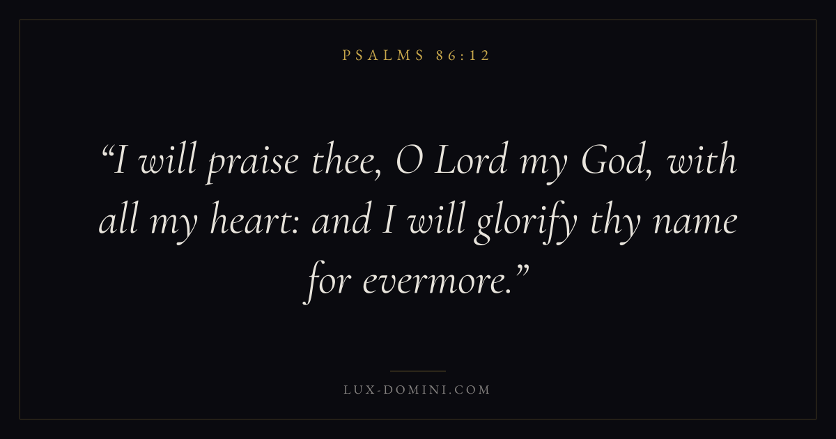 Books / Psalms / Chapter 86 / Verse 12 ← Psalms 86:11 Psalms 86:12 Psalms 86:13 → I will praise thee, O Lord my God, with all my heart: and I will glorify thy name for evermore. Download verse card Share on Twitter Share on Facebook Pin it ✦ Key themes LoveFaithPrayerTruthPraise Read with John 3:161 Corinthians 13:4Hebrews 11:1Romans 10:17 Related topics Bible verses about loveBible verses about faithBible verses about prayerBible verses about truthBible verses about thankfulness and gratitude ✦ Psalms Chapter 86 verses V. 1 V. 2 V. 3 V. 4 V. 5 V. 6 V. 7 V. 8 V. 9 V. 10 V. 11 V. 12 V. 13 V. 14 V. 15 V. 16 V. 17