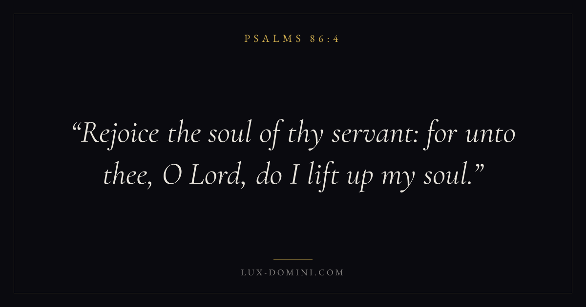 Books / Psalms / Chapter 86 / Verse 4 ← Psalms 86:3 Psalms 86:4 Psalms 86:5 → Rejoice the soul of thy servant: for unto thee, O Lord, do I lift up my soul. Download verse card Share on Twitter Share on Facebook Pin it ✦ Key themes FaithPrayerGracePraise Read with Hebrews 11:1Romans 10:17Matthew 6:9Luke 18:1 Related topics Bible verses about faithBible verses about prayerBible verses about graceBible verses about thankfulness and gratitude ✦ Psalms Chapter 86 verses V. 1 V. 2 V. 3 V. 4 V. 5 V. 6 V. 7 V. 8 V. 9 V. 10 V. 11 V. 12 V. 13 V. 14 V. 15 V. 16 V. 17