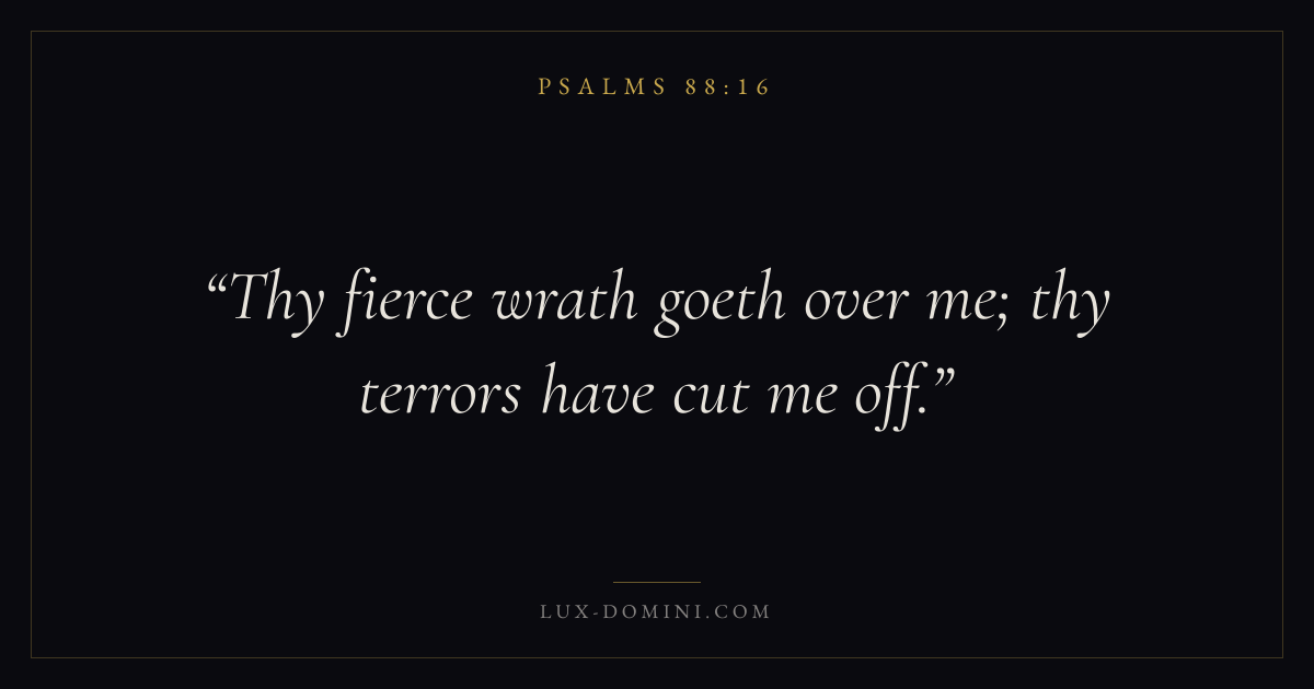 Books / Psalms / Chapter 88 / Verse 16 ← Psalms 88:15 Psalms 88:16 Psalms 88:17 → Thy fierce wrath goeth over me; thy terrors have cut me off. Download verse card Share on Twitter Share on Facebook Pin it ✦ Key themes FaithPrayerJustice and mercySalvationPraise Read with Hebrews 11:1Romans 10:17Matthew 6:9Luke 18:1 Related topics Bible verses about faithBible verses about prayerBible verses about justice and mercyBible verses about salvationBible verses about thankfulness and gratitude ✦ Psalms Chapter 88 verses V. 1 V. 2 V. 3 V. 4 V. 5 V. 6 V. 7 V. 8 V. 9 V. 10 V. 11 V. 12 V. 13 V. 14 V. 15 V. 16 V. 17 V. 18