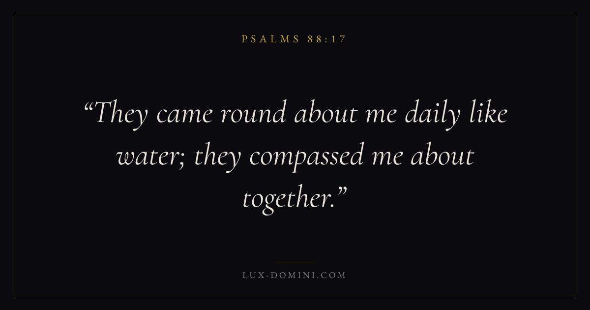 Books / Psalms / Chapter 88 / Verse 17 ← Psalms 88:16 Psalms 88:17 Psalms 88:18 → They came round about me daily like water; they compassed me about together. Download verse card Share on Twitter Share on Facebook Pin it ✦ Key themes FaithPrayerJustice and mercySalvationPraise Read with Hebrews 11:1Romans 10:17Matthew 6:9Luke 18:1 Related topics Bible verses about faithBible verses about prayerBible verses about justice and mercyBible verses about salvationBible verses about thankfulness and gratitude ✦ Psalms Chapter 88 verses V. 1 V. 2 V. 3 V. 4 V. 5 V. 6 V. 7 V. 8 V. 9 V. 10 V. 11 V. 12 V. 13 V. 14 V. 15 V. 16 V. 17 V. 18